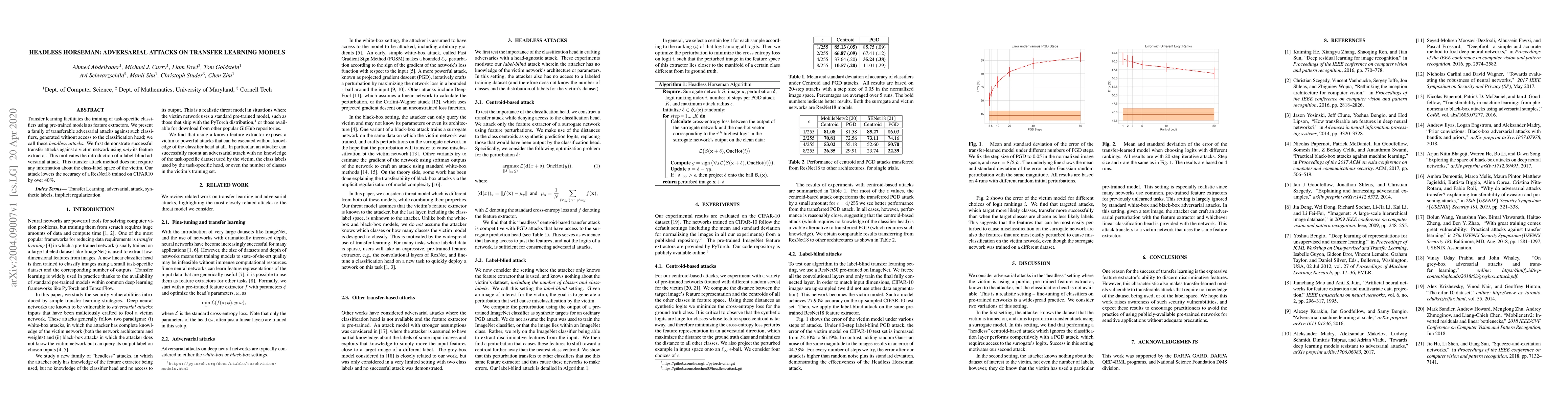 Transfer learning facilitates the training of task-specific classifiers using pre-trained models as feature extractors. We present a family of transferable adversarial attacks against such classifiers, generated without access to the classification head; we call these \emph{headless attacks}. We first demonstrate successful transfer attacks against a victim network using \textit{only} its feature extractor. This motivates the introduction of a label-blind adversarial attack. This transfer attack method does not require any information about the class-label space of the victim. Our attack lowers the accuracy of a ResNet18 trained on CIFAR10 by over 40\%.