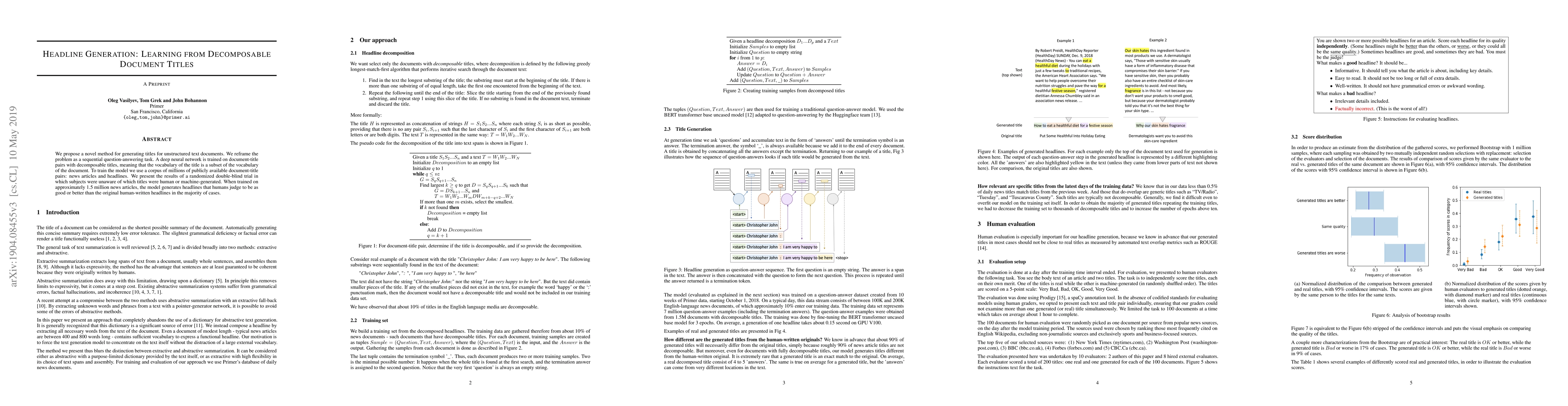 We propose a novel method for generating titles for unstructured text documents. We reframe the problem as a sequential question-answering task. A deep neural network is trained on document-title pairs with decomposable titles, meaning that the vocabulary of the title is a subset of the vocabulary of the document. To train the model we use a corpus of millions of publicly available document-title pairs: news articles and headlines. We present the results of a randomized double-blind trial in which subjects were unaware of which titles were human or machine-generated. When trained on approximately 1.5 million news articles, the model generates headlines that humans judge to be as good or better than the original human-written headlines in the majority of cases.