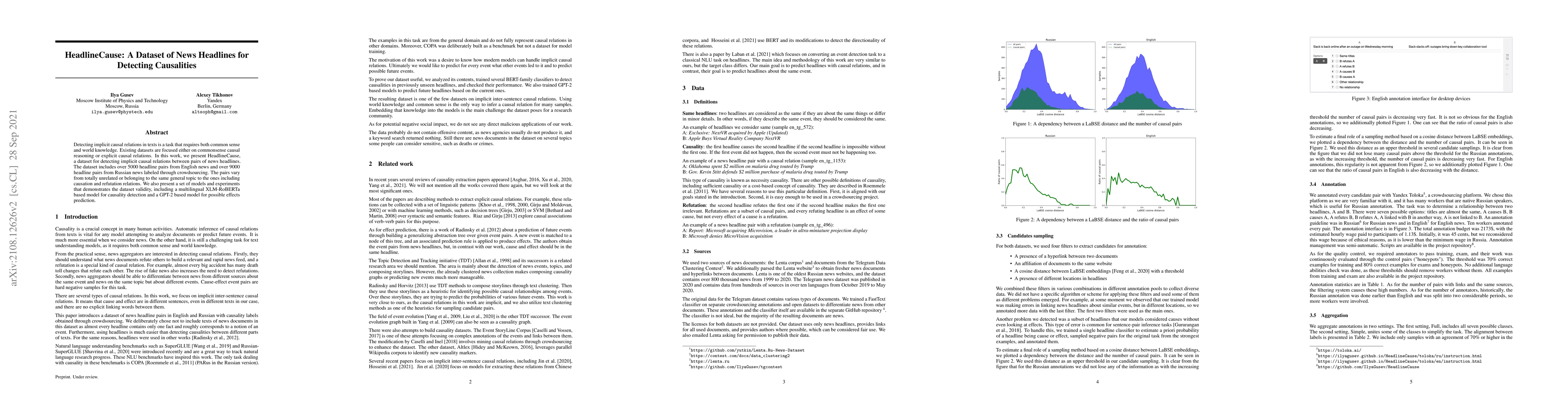 Detecting implicit causal relations in texts is a task that requires both common sense and world knowledge. Existing datasets are focused either on commonsense causal reasoning or explicit causal relations. In this work, we present HeadlineCause, a dataset for detecting implicit causal relations between pairs of news headlines. The dataset includes over 5000 headline pairs from English news and over 9000 headline pairs from Russian news labeled through crowdsourcing. The pairs vary from totally unrelated or belonging to the same general topic to the ones including causation and refutation relations. We also present a set of models and experiments that demonstrates the dataset validity, including a multilingual XLM-RoBERTa based model for causality detection and a GPT-2 based model for possible effects prediction.