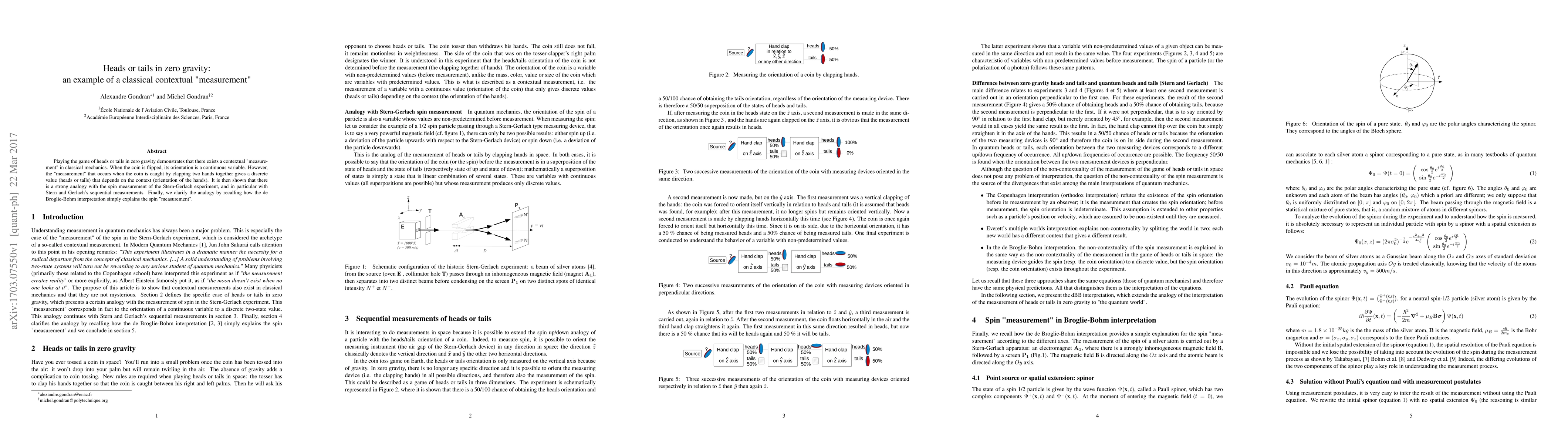 Playing the game of heads or tails in zero gravity demonstrates that there exists a contextual "measurement" in classical mechanics. When the coin is flipped, its orientation is a continuous variable. However, the "measurement" that occurs when the coin is caught by clapping two hands together gives a discrete value (heads or tails) that depends on the context (orientation of the hands). It is then shown that there is a strong analogy with the spin measurement of the Stern-Gerlach experiment, and in particular with Stern and Gerlach's sequential measurements. Finally, we clarify the analogy by recalling how the de Broglie-Bohm interpretation simply explains the spin "measurement".