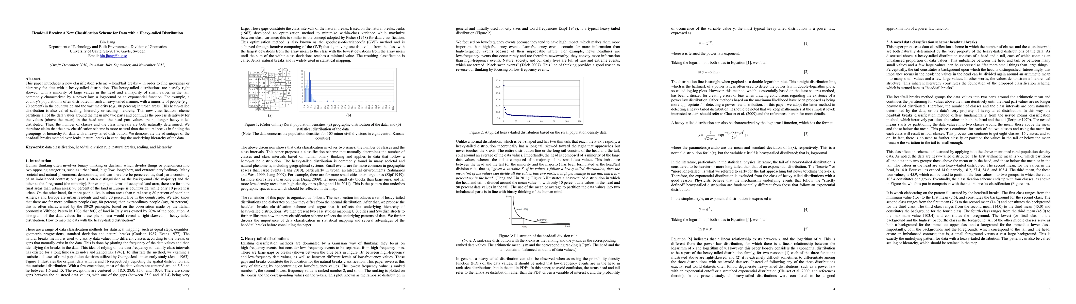 This paper introduces a head/tail breaks classification scheme to naturally partition data with heavy-tailed distributions, iteratively dividing the larger values until they no longer exhibit heavy-tail characteristics, thus determining class intervals. The method is shown to better capture data hierarchy compared to traditional Jenks' natural breaks.