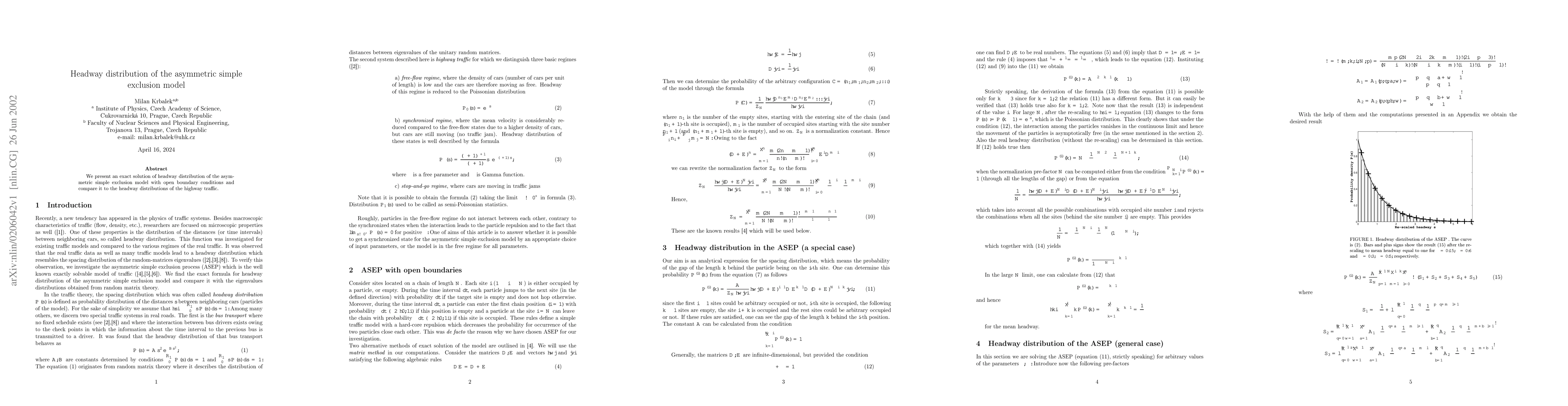 We present an exact solution of headway distribution of the asymmetric simple exclusion model with open boundary conditions and compare it to the headway distributions of the highway traffic.