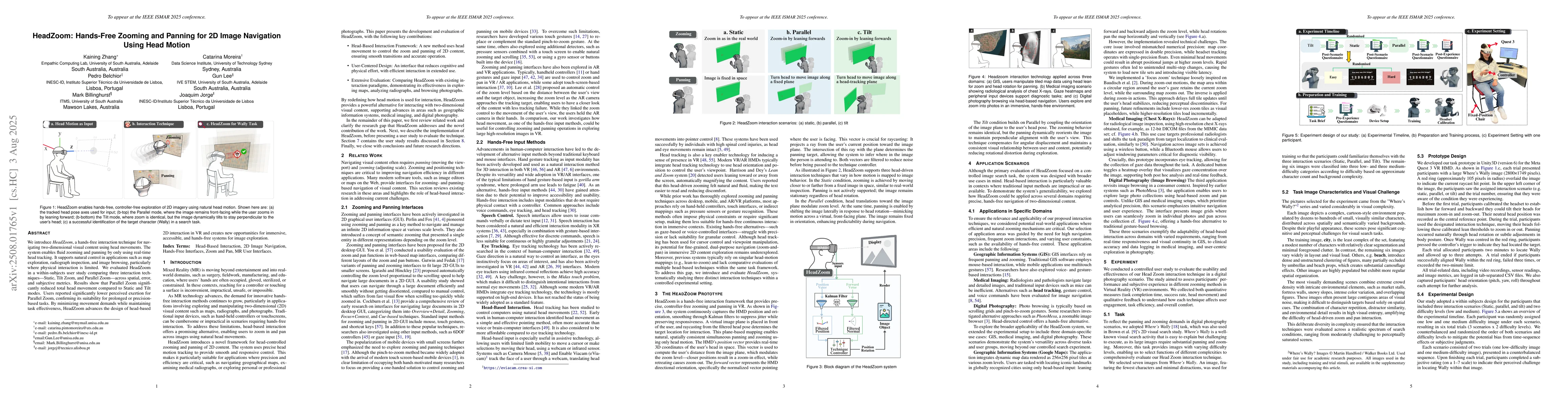 HeadZoom introduces a hands-free, controller-free interaction technique for navigating 2D content using natural head motion, enabling fluid panning and zooming.