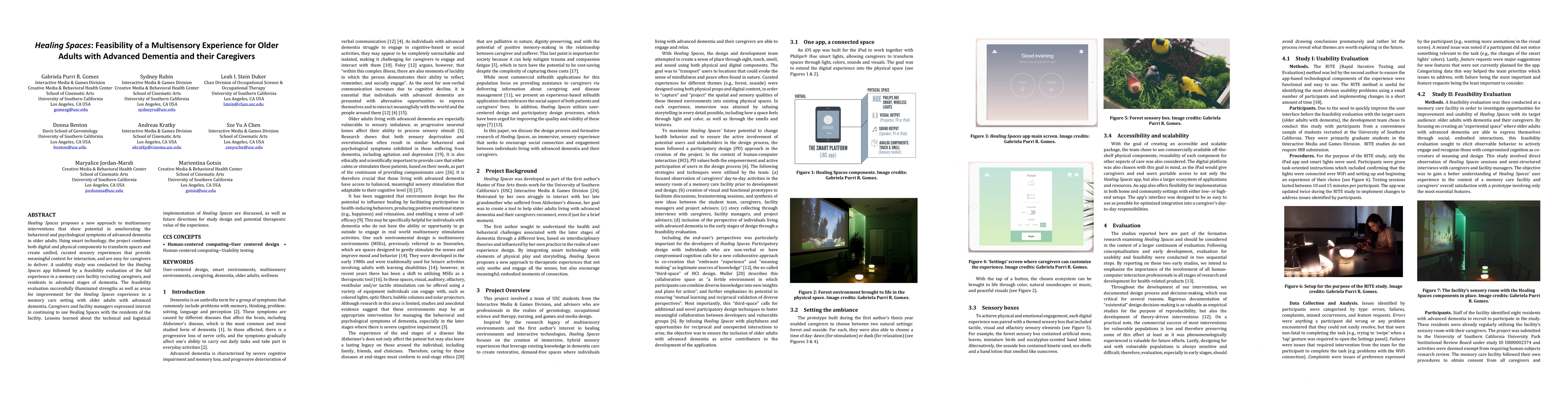 The Healing Spaces project explores a multisensory intervention using smart technology to alleviate symptoms in older adults with advanced dementia, combining digital and physical elements for meaningful caregiver-resident interactions. Initial feasibility studies in a memory care facility showed positive interest and identified areas for improvement, suggesting potential therapeutic benefits.