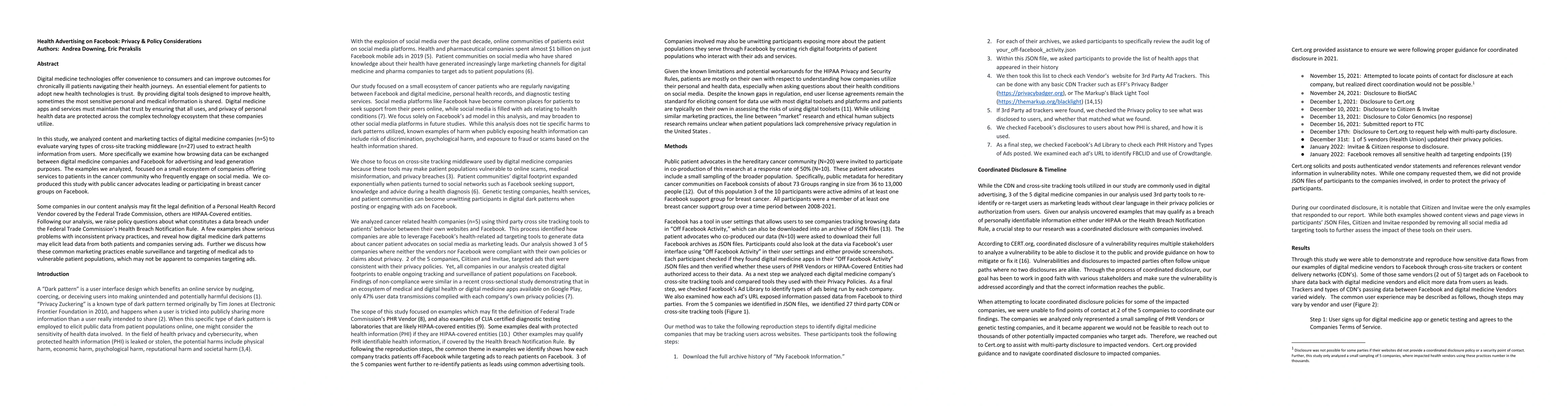 In this study we analyzed content and marketing tactics of digital medicine companies to evaluate various types of cross site tracking middleware used to extract health information from users without permission. More specifically we examine how browsing data can be exchanged between digital medicine companies and Facebook for advertising and lead generation purposes. The analysis was focused on a small ecosystem of companies offering services to patients within the cancer community that frequently engage on social media. Some companies in our content analysis may fit the legal definition of a personal health record vendor covered by the Federal Trade Commission, others are HIPAA covered entities. The findings of our analysis raise policy questions about what constitutes a breach under the Federal trade Commission's Health Breach Notification Rule. Several examples demonstrate serious problems with inconsistent privacy practices and reveal how digital medicine dark patterns may elicit unauthorized data from patients and companies serving ads. Further we discuss how these common marketing practices enable surveillance and targeting of medical ads to vulnerable patient populations, which may not be apparent to the companies targeting ads.