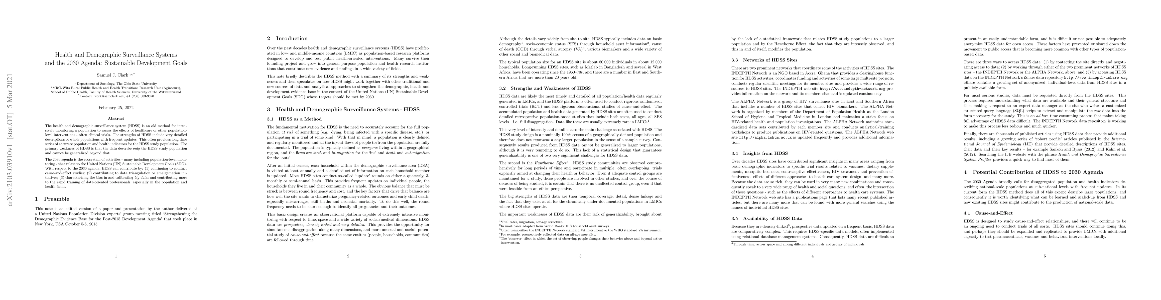 The health and demographic surveillance system (HDSS) is an old method for intensively monitoring a population to assess the effects of healthcare or other population-level interventions - often clinical trials. The strengths of HDSS include very detailed descriptions of whole populations with frequent updates. This often provides long time series of accurate population and health indicators for the HDSS study population. The primary weakness of HDSS is that the data describe only the HDSS study population and cannot be generalized beyond that. The 2030 agenda is the ecosystem of activities - many including population-level monitoring - that relate to the United Nations (UN) Sustainable Development Goals (SDG). With respect to the 2030 agenda, HDSS can contribute by: continuing to conduct cause-and-effect studies; contributing to data triangulation or amalgamation initiatives; characterizing the bias in and calibrating 'big data'; and contributing more to the rapid training of data-oriented professionals, especially in the population and health fields.