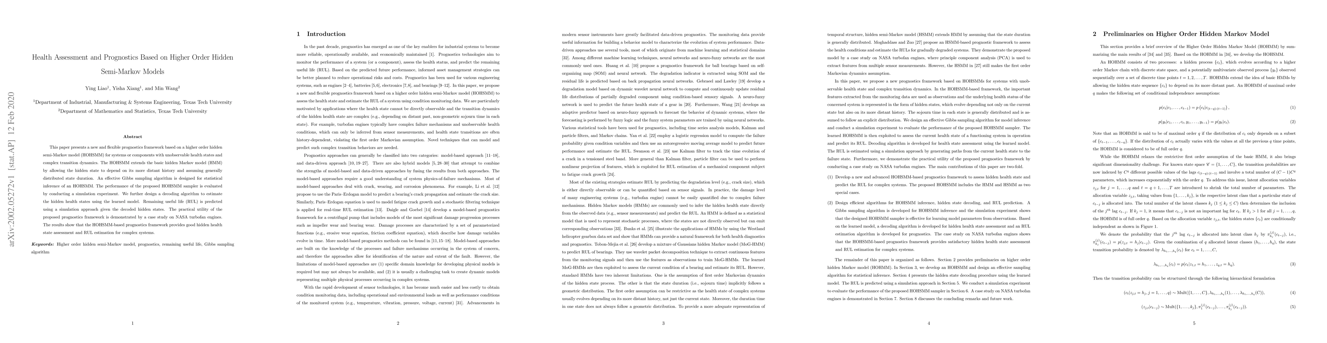 This paper introduces a higher order hidden semi-Markov model (HOHSMM) for assessing health and predicting remaining useful life (RUL) in systems with complex transition dynamics. The HOHSMM framework, supported by a Gibbs sampling algorithm, demonstrates effective hidden state estimation and RUL prediction, validated through a case study on NASA turbofan engines.