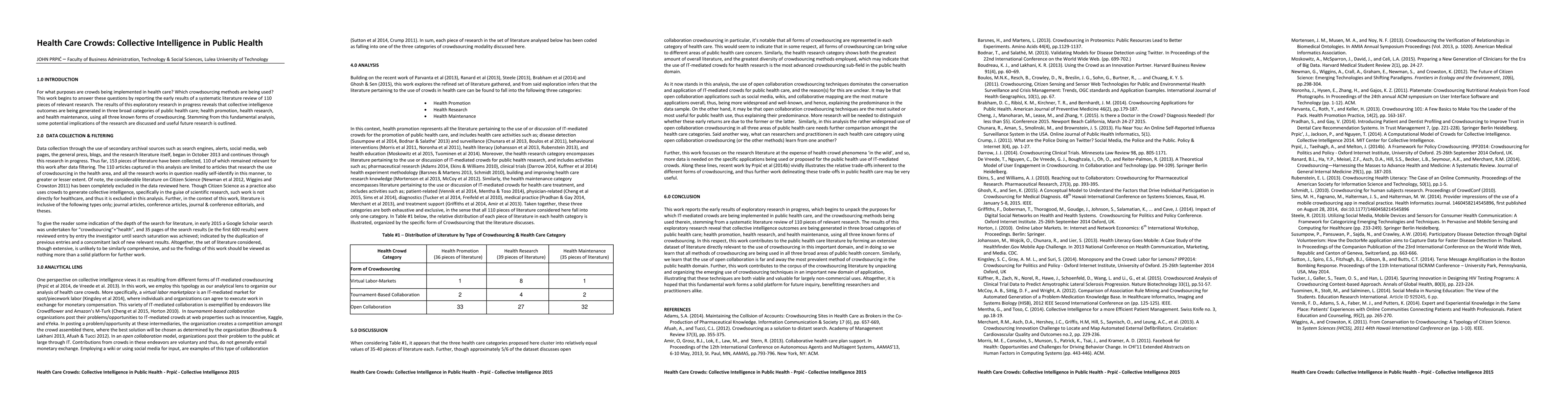 For what purposes are crowds being implemented in health care? Which crowdsourcing methods are being used? This work begins to answer these questions by reporting the early results of a systematic literature review of 110 pieces of relevant research. The results of this exploratory research in progress reveals that collective intelligence outcomes are being generated in three broad categories of public health care; health promotion, health research, and health maintenance, using all three known forms of crowdsourcing. Stemming from this fundamental analysis, some potential implications of the research are discussed and useful future research is outlined.