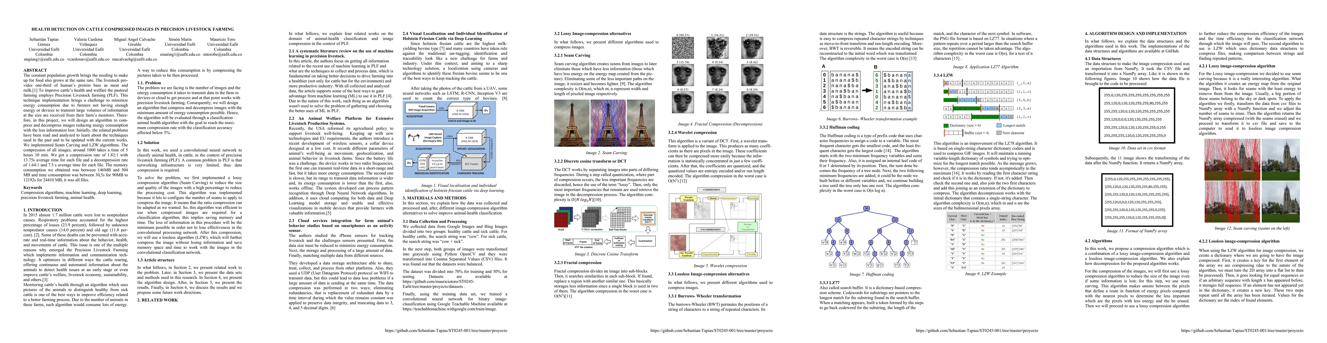 The constant population growth brings the needing to make up for food also grows at the same rate. The livestock provides one-third of humans protein base as meat and milk. To improve cattles health and welfare the pastoral farming employs Precision Livestock farming (PLF). This technique implementation brings a challenge to minimize energy consumption due to farmers not having enough energy or devices to transmit large volumes of information at the size are received from their farms monitors. Therefore, in this project, we will design an algorithm to compress and decompress images reducing energy consumption with the less information lost. Initially, the related problems have been read and analyzed to learn about the techniques used in the past and to be updated with the current works. We implemented Seam Carving and LZW algorithms. The compression of all images, around 1000 takes a time of 5 hours 10 min. We got a compression rate of 1.82:1 with 13.75s average time for each file and a decompression rate of 1.64:1 and 7.5 s average time for each file. The memory consumption we obtained was between 146MB and 504 MB and time consumption was between 30,5s for 90MB to 12192s for 24410 MB, it was all files.