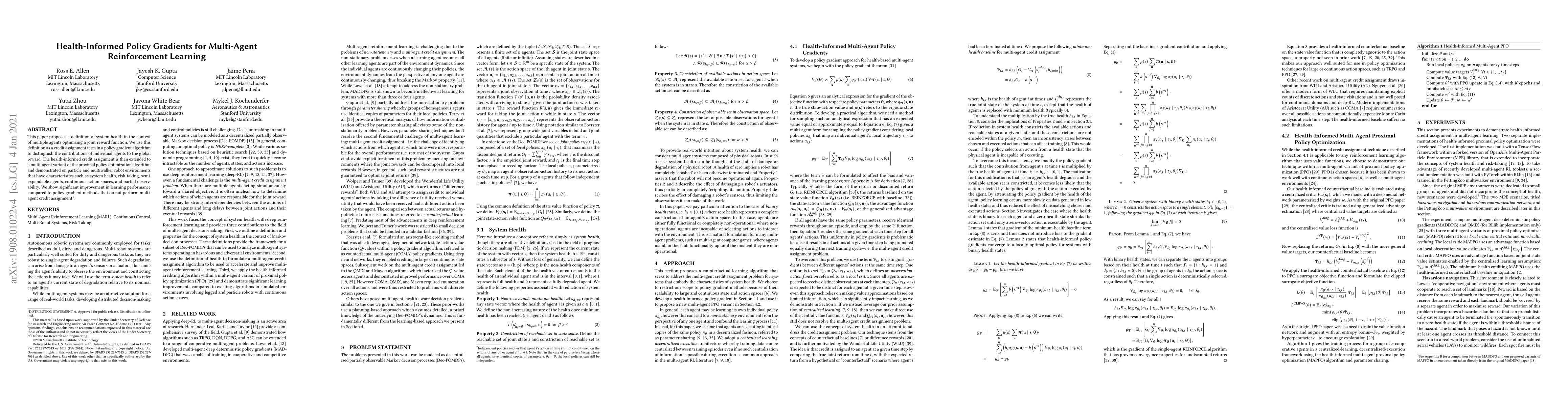 This paper introduces a health-informed policy gradient method for multi-agent reinforcement learning, using system health as a credit assignment term to improve individual agent contributions. The method shows significant learning performance improvements over traditional methods in complex, multi-agent environments.