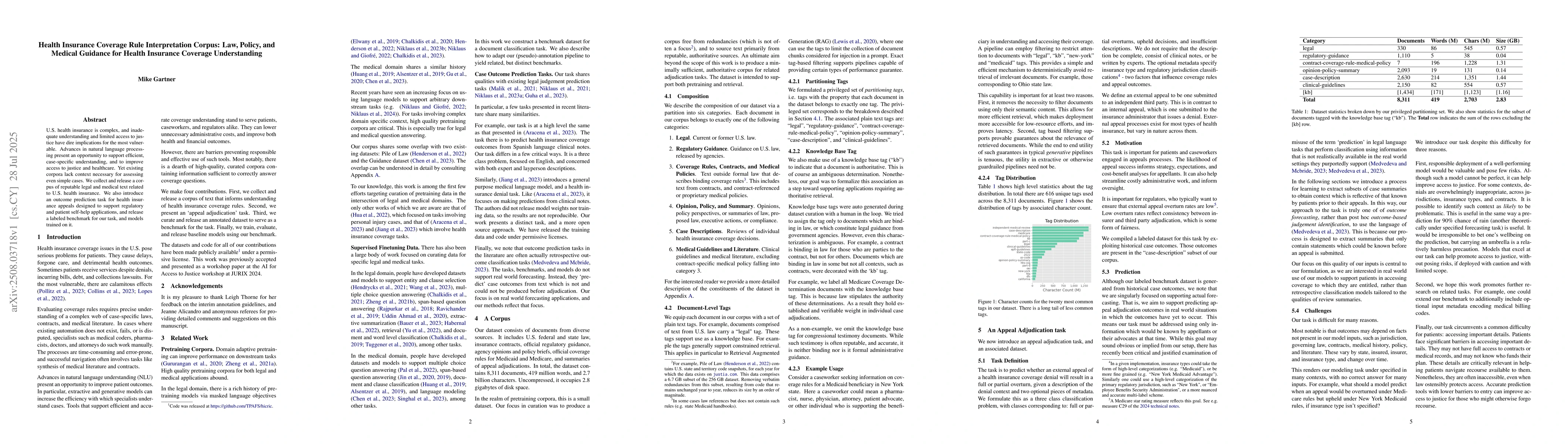 U.S. health insurance is complex, and inadequate understanding and limited access to justice have dire implications for the most vulnerable. Advances in natural language processing present an opportunity to support efficient, case-specific understanding, and to improve access to justice and healthcare. Yet existing corpora lack context necessary for assessing even simple cases. We collect and release a corpus of reputable legal and medical text related to U.S. health insurance. We also introduce an outcome prediction task for health insurance appeals designed to support regulatory and patient self-help applications, and release a labeled benchmark for our task, and models trained on it.