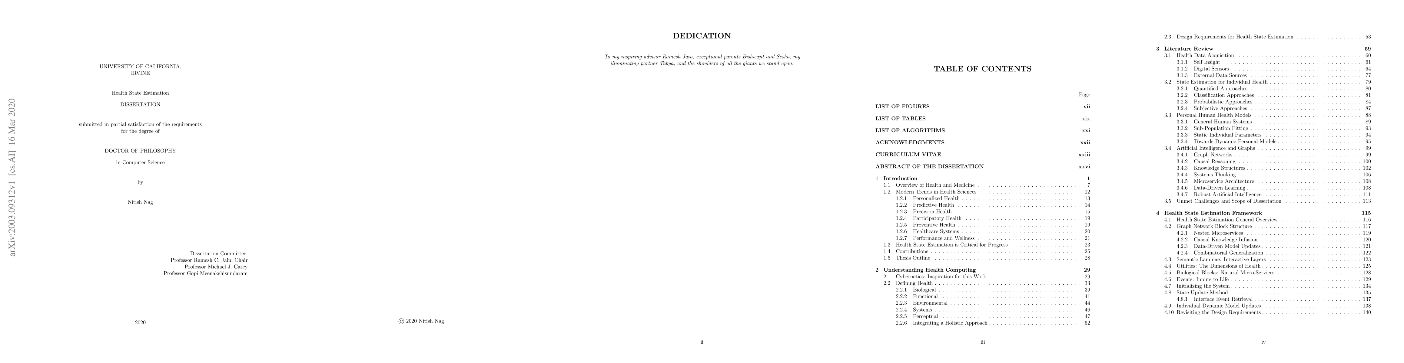 Life's most valuable asset is health. Continuously understanding the state of our health and modeling how it evolves is essential if we wish to improve it. Given the opportunity that people live with more data about their life today than any other time in history, the challenge rests in interweaving this data with the growing body of knowledge to compute and model the health state of an individual continually. This dissertation presents an approach to build a personal model and dynamically estimate the health state of an individual by fusing multi-modal data and domain knowledge. The system is stitched together from four essential abstraction elements: 1. the events in our life, 2. the layers of our biological systems (from molecular to an organism), 3. the functional utilities that arise from biological underpinnings, and 4. how we interact with these utilities in the reality of daily life. Connecting these four elements via graph network blocks forms the backbone by which we instantiate a digital twin of an individual. Edges and nodes in this graph structure are then regularly updated with learning techniques as data is continuously digested. Experiments demonstrate the use of dense and heterogeneous real-world data from a variety of personal and environmental sensors to monitor individual cardiovascular health state. State estimation and individual modeling is the fundamental basis to depart from disease-oriented approaches to a total health continuum paradigm. Precision in predicting health requires understanding state trajectory. By encasing this estimation within a navigational approach, a systematic guidance framework can plan actions to transition a current state towards a desired one. This work concludes by presenting this framework of combining the health state and personal graph model to perpetually plan and assist us in living life towards our goals.