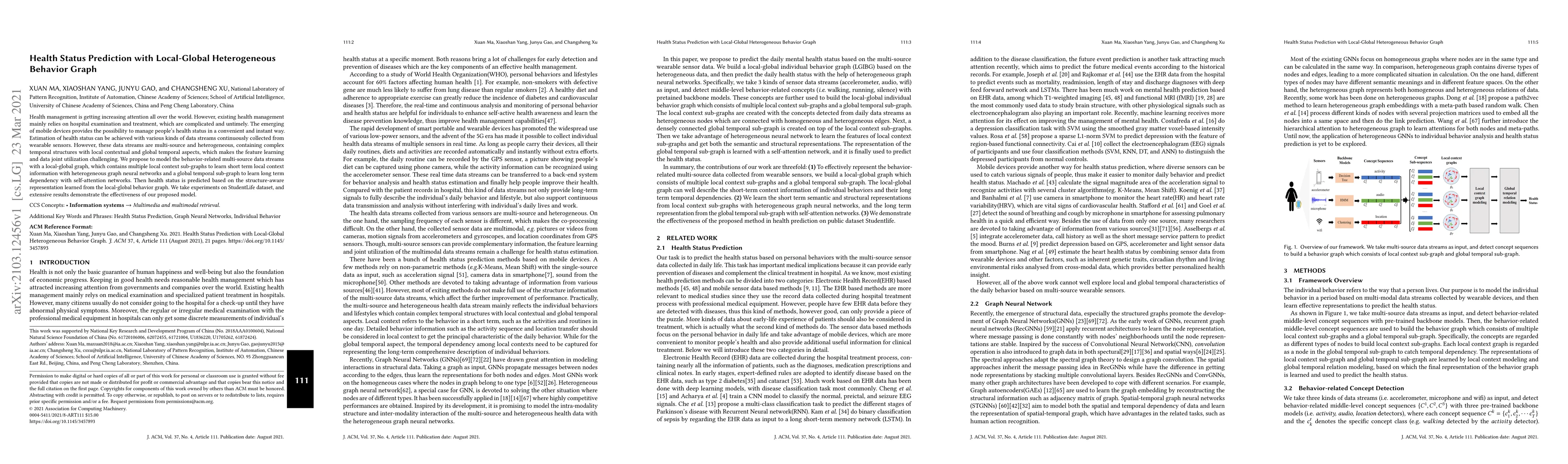 This paper proposes a local-global heterogeneous behavior graph model to predict health status using multi-source data streams from wearable sensors. The model employs graph neural networks for local context learning and self-attention networks for global temporal dependencies, demonstrating effective health status prediction on the StudentLife dataset.