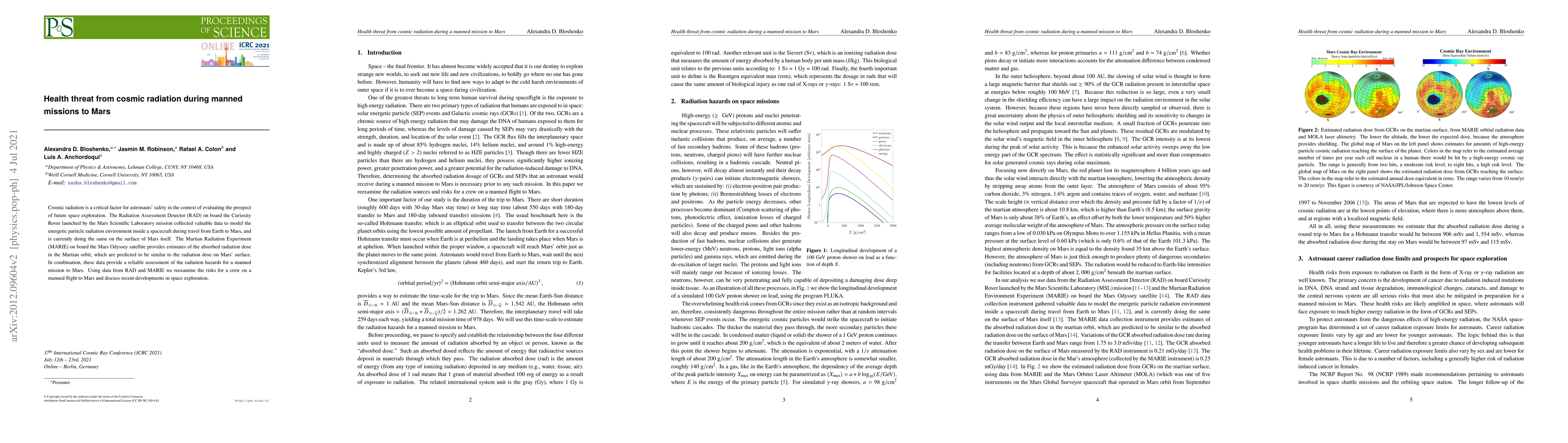 This paper evaluates the health risks posed by cosmic radiation to astronauts during a manned mission to Mars, using data from the RAD on Curiosity and MARIE on Mars Odyssey. It assesses the radiation hazards and discusses recent advancements in space exploration.