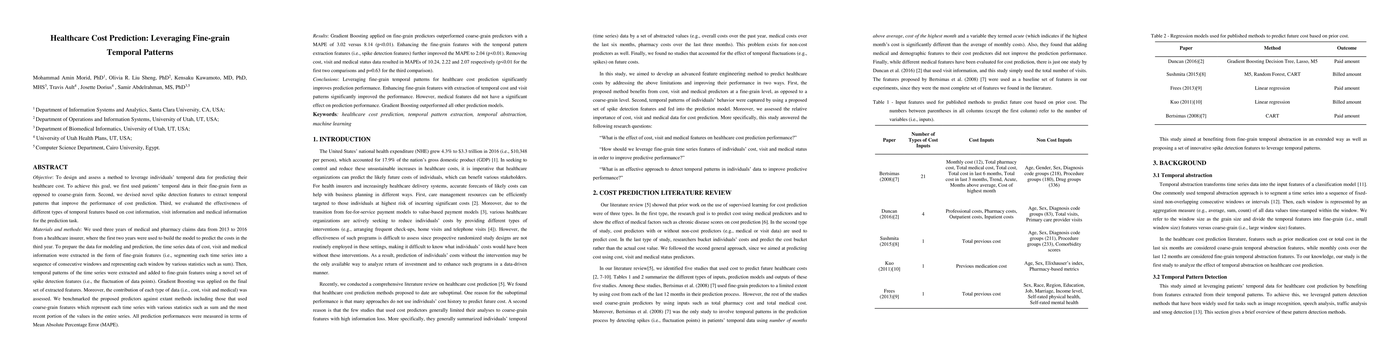 This study developed a method to predict healthcare costs using fine-grain temporal patterns extracted from patients' data, showing significant improvement over coarse-grain data. Gradient Boosting was found to be the most effective model, with fine-grain temporal features significantly enhancing prediction accuracy, though medical features had little impact.
