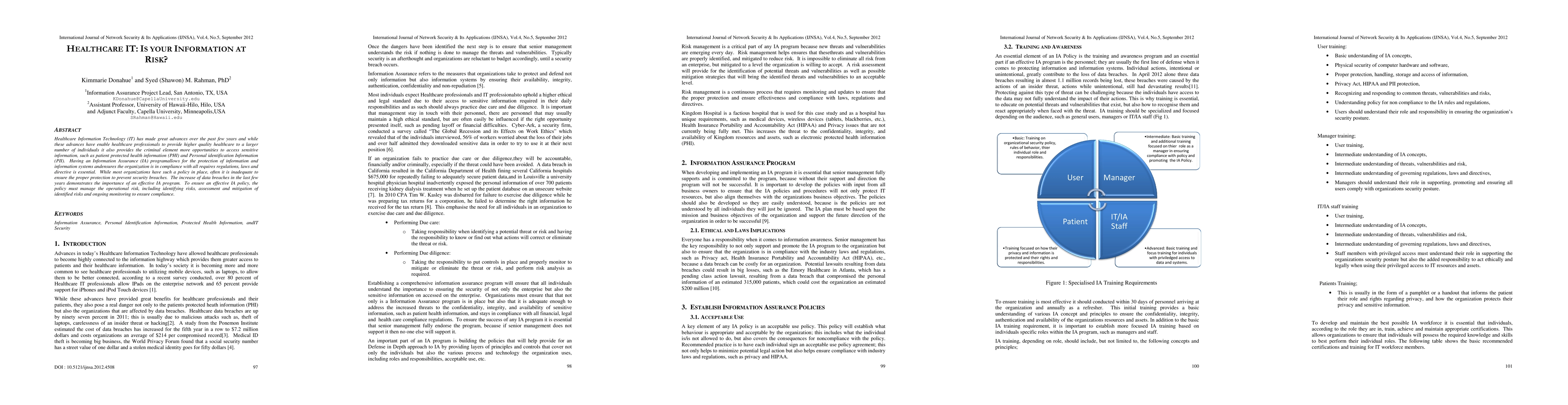 Healthcare Information Technology (IT) has made great advances over the past few years and while these advances have enable healthcare professionals to provide higher quality healthcare to a larger number of individuals it also provides the criminal element more opportunities to access sensitive information, such as patient protected health information (PHI) and Personal identification Information (PII). Having an Information Assurance (IA) programallows for the protection of information and information systems and ensures the organization is in compliance with all requires regulations, laws and directive is essential. While most organizations have such a policy in place, often it is inadequate to ensure the proper protection to prevent security breaches. The increase of data breaches in the last few years demonstrates the importance of an effective IA program. To ensure an effective IA policy, the policy must manage the operational risk, including identifying risks, assessment and mitigation of identified risks and ongoing monitoring to ensure compliance