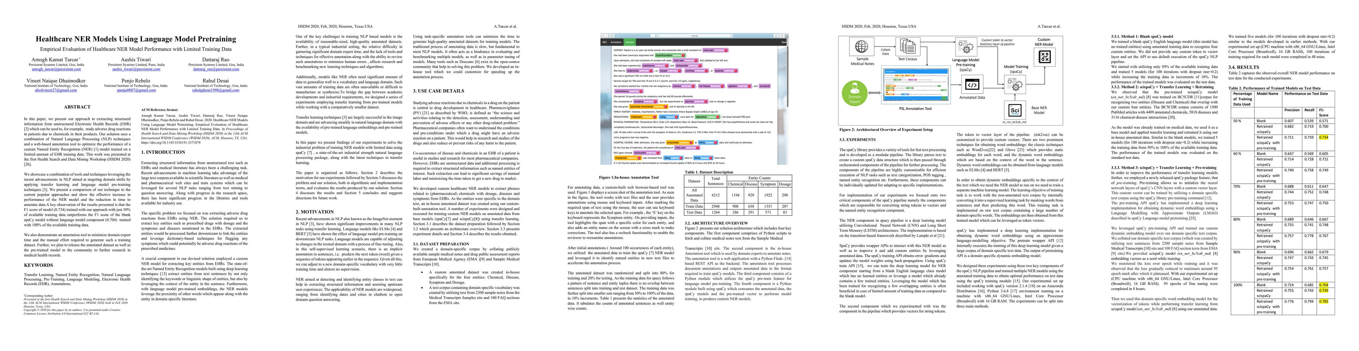 In this paper, we present our approach to extracting structured information from unstructured Electronic Health Records (EHR) [2] which can be used to, for example, study adverse drug reactions in patients due to chemicals in their products. Our solution uses a combination of Natural Language Processing (NLP) techniques and a web-based annotation tool to optimize the performance of a custom Named Entity Recognition (NER) [1] model trained on a limited amount of EHR training data. This work was presented at the first Health Search and Data Mining Workshop (HSDM 2020) [26]. We showcase a combination of tools and techniques leveraging the recent advancements in NLP aimed at targeting domain shifts by applying transfer learning and language model pre-training techniques [3]. We present a comparison of our technique to the current popular approaches and show the effective increase in performance of the NER model and the reduction in time to annotate data.A key observation of the results presented is that the F1 score of model (0.734) trained with our approach with just 50% of available training data outperforms the F1 score of the blank spaCy model without language model component (0.704) trained with 100% of the available training data. We also demonstrate an annotation tool to minimize domain expert time and the manual effort required to generate such a training dataset. Further, we plan to release the annotated dataset as well as the pre-trained model to the community to further research in medical health records.