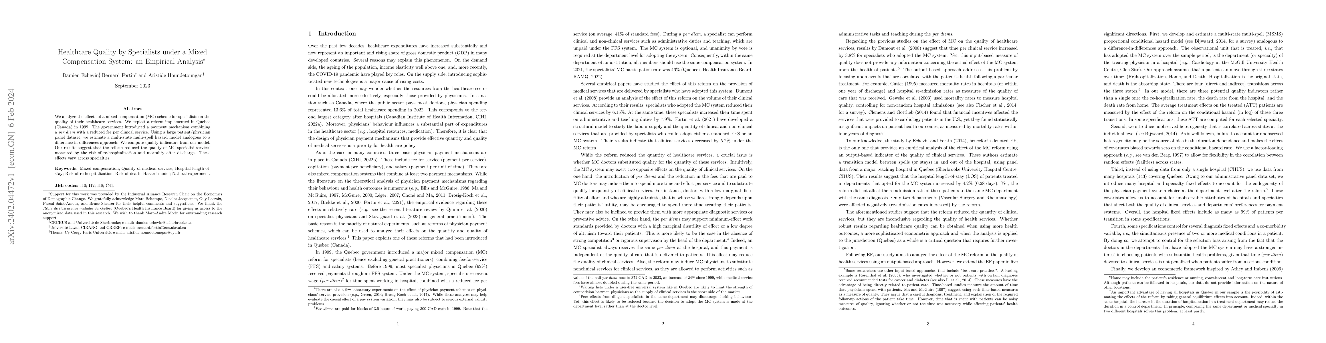 This study evaluates the impact of a mixed compensation scheme on healthcare quality in Quebec, Canada, finding that the reform led to a decline in specialist service quality, particularly in terms of re-hospitalization and mortality rates, with varying effects across different medical specialties.