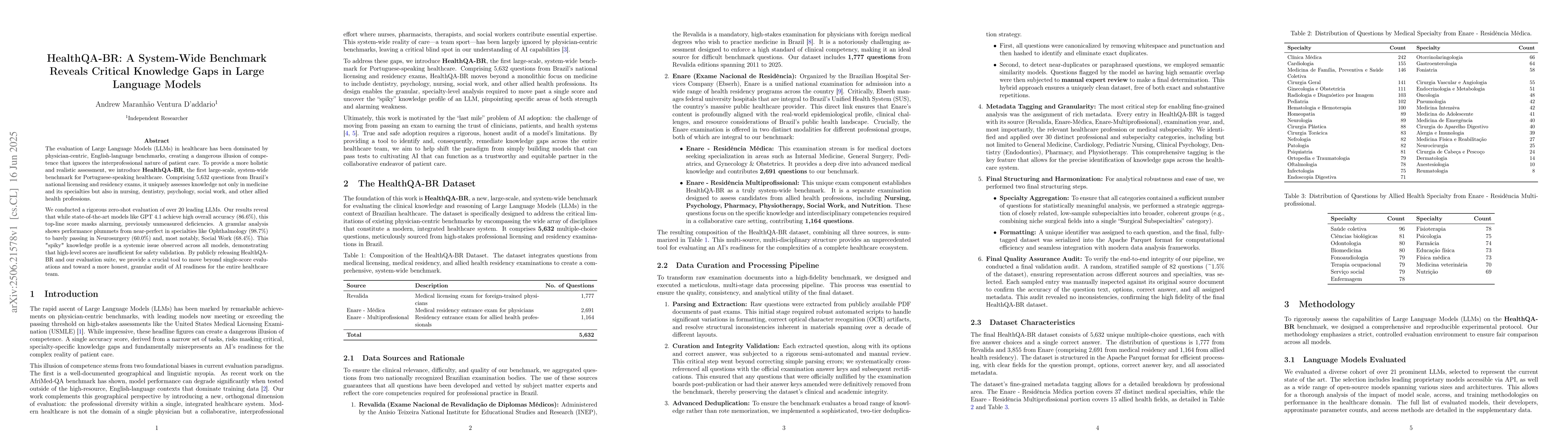 The evaluation of Large Language Models (LLMs) in healthcare has been dominated by physician-centric, English-language benchmarks, creating a dangerous illusion of competence that ignores the interprofessional nature of patient care. To provide a more holistic and realistic assessment, we introduce HealthQA-BR, the first large-scale, system-wide benchmark for Portuguese-speaking healthcare. Comprising 5,632 questions from Brazil's national licensing and residency exams, it uniquely assesses knowledge not only in medicine and its specialties but also in nursing, dentistry, psychology, social work, and other allied health professions. We conducted a rigorous zero-shot evaluation of over 20 leading LLMs. Our results reveal that while state-of-the-art models like GPT 4.1 achieve high overall accuracy (86.6%), this top-line score masks alarming, previously unmeasured deficiencies. A granular analysis shows performance plummets from near-perfect in specialties like Ophthalmology (98.7%) to barely passing in Neurosurgery (60.0%) and, most notably, Social Work (68.4%). This "spiky" knowledge profile is a systemic issue observed across all models, demonstrating that high-level scores are insufficient for safety validation. By publicly releasing HealthQA-BR and our evaluation suite, we provide a crucial tool to move beyond single-score evaluations and toward a more honest, granular audit of AI readiness for the entire healthcare team.