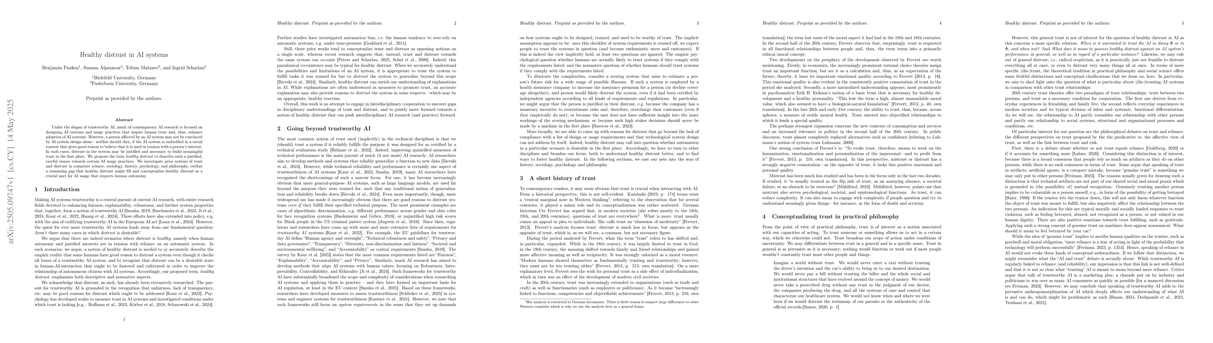 Research proposes a concept of 'healthy distrust' towards AI systems that respect human autonomy, acknowledging that trust in AI may not always be justified. Healthy distrust is seen as a crucial aspect for building meaningful trust in AI usage.
