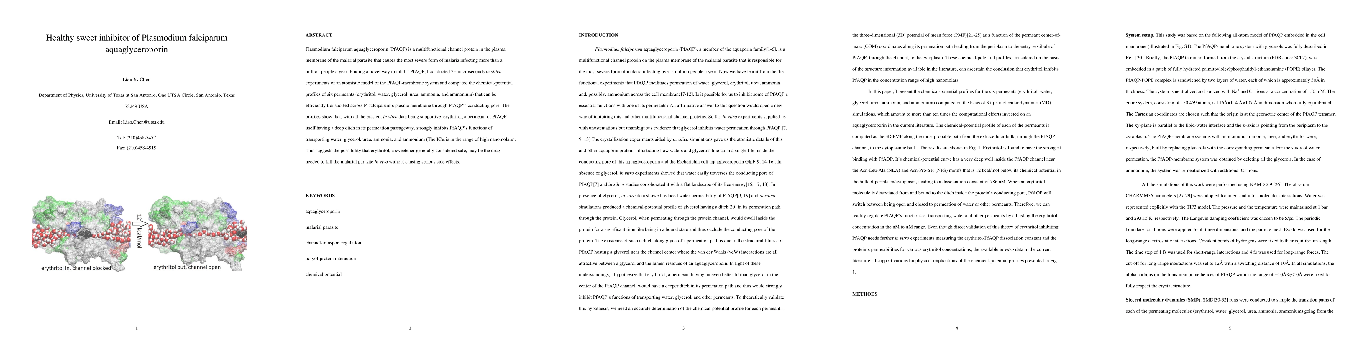 This study identifies erythritol, a safe sweetener, as a potent inhibitor of Plasmodium falciparum aquaglyceroporin (PfAQP) based on in silico experiments. The findings suggest erythritol could potentially serve as a novel, effective, and side-effect-free treatment for malaria.