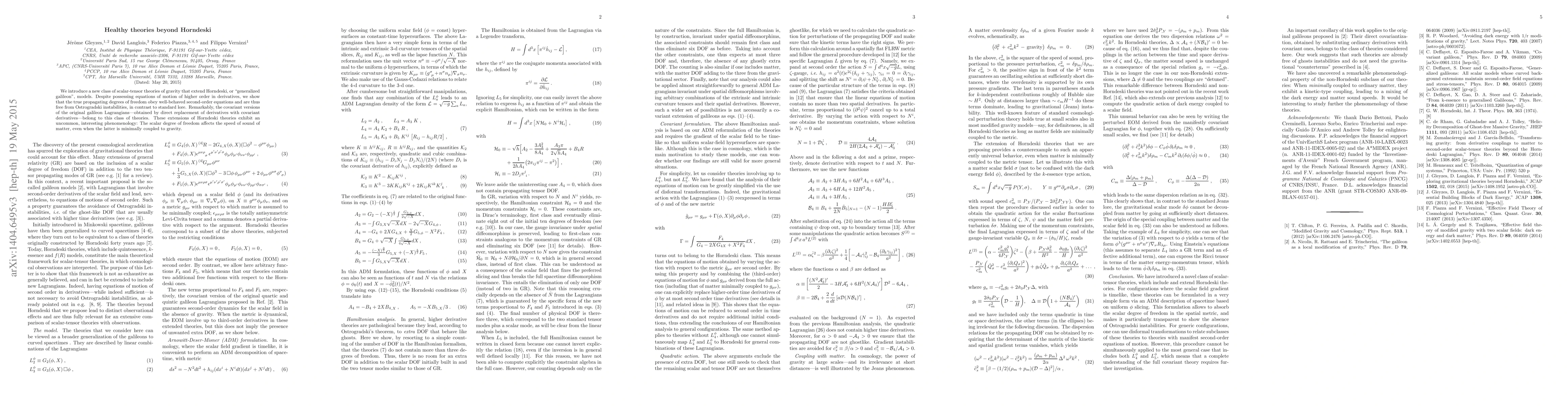 This paper proposes a new class of scalar-tensor theories extending Horndeski models, which despite higher-order derivative equations, maintain second-order equations for propagating degrees of freedom, avoiding Ostrogradski instabilities. The covariant versions of original galileon Lagrangians are included in this class, showcasing unique phenomenology where the scalar field influences the speed of sound of matter even in minimal coupling scenarios.