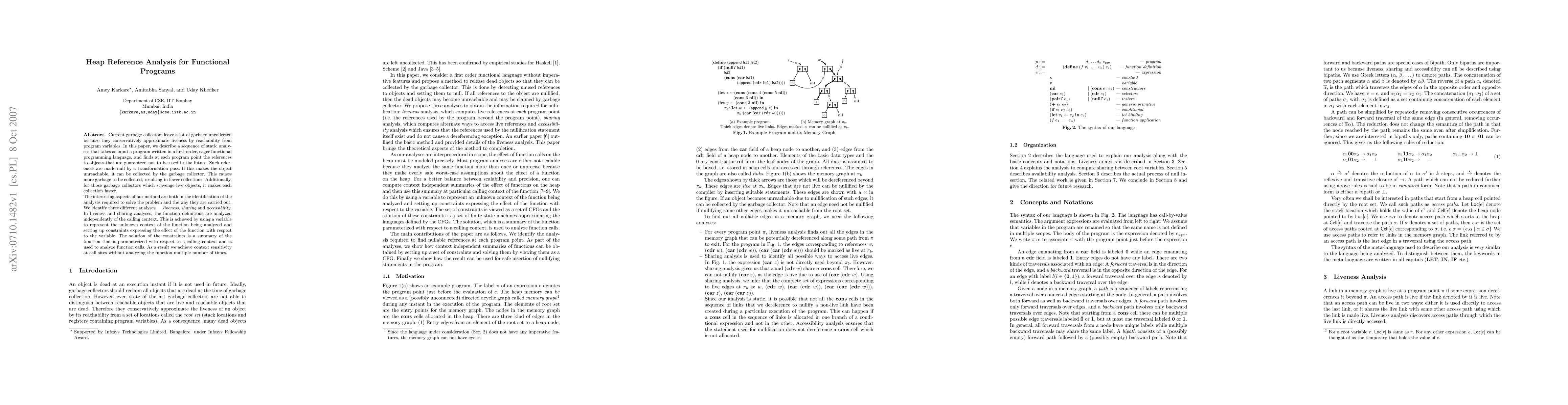 Current garbage collectors leave a lot of garbage uncollected because they conservatively approximate liveness by reachability from program variables. In this paper, we describe a sequence of static analyses that takes as input a program written in a first-order, eager functional programming language, and finds at each program point the references to objects that are guaranteed not to be used in the future. Such references are made null by a transformation pass. If this makes the object unreachable, it can be collected by the garbage collector. This causes more garbage to be collected, resulting in fewer collections. Additionally, for those garbage collectors which scavenge live objects, it makes each collection faster. The interesting aspects of our method are both in the identification of the analyses required to solve the problem and the way they are carried out. We identify three different analyses -- liveness, sharing and accessibility. In liveness and sharing analyses, the function definitions are analyzed independently of the calling context. This is achieved by using a variable to represent the unknown context of the function being analyzed and setting up constraints expressing the effect of the function with respect to the variable. The solution of the constraints is a summary of the function that is parameterized with respect to a calling context and is used to analyze function calls. As a result we achieve context sensitivity at call sites without analyzing the function multiple number of times.
