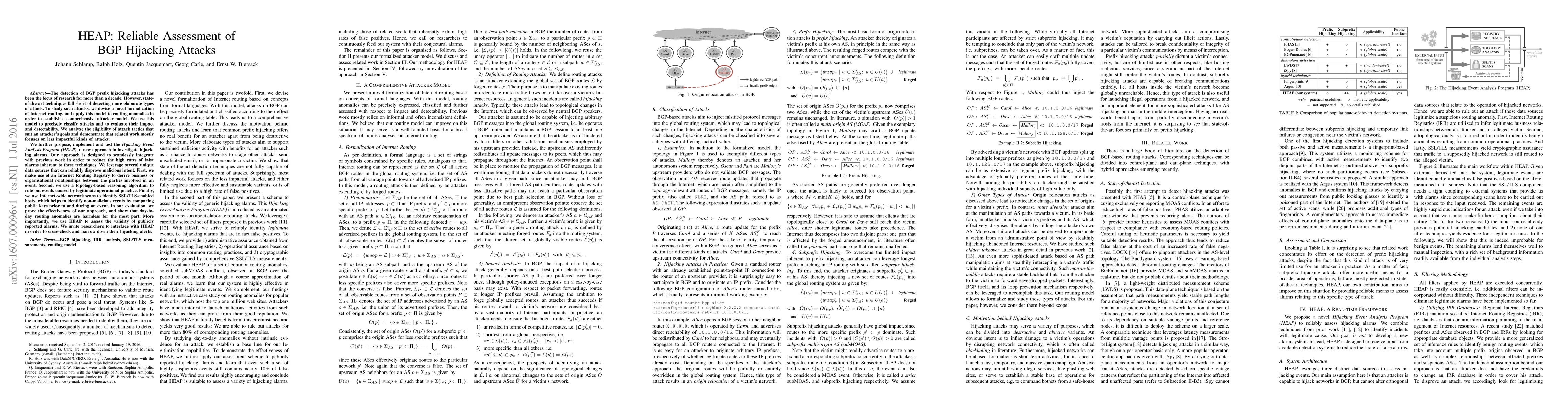 HEAP proposes a novel approach to investigate hijacking alarms using Internet Routing Registry, topology-based reasoning algorithm, and network scans.