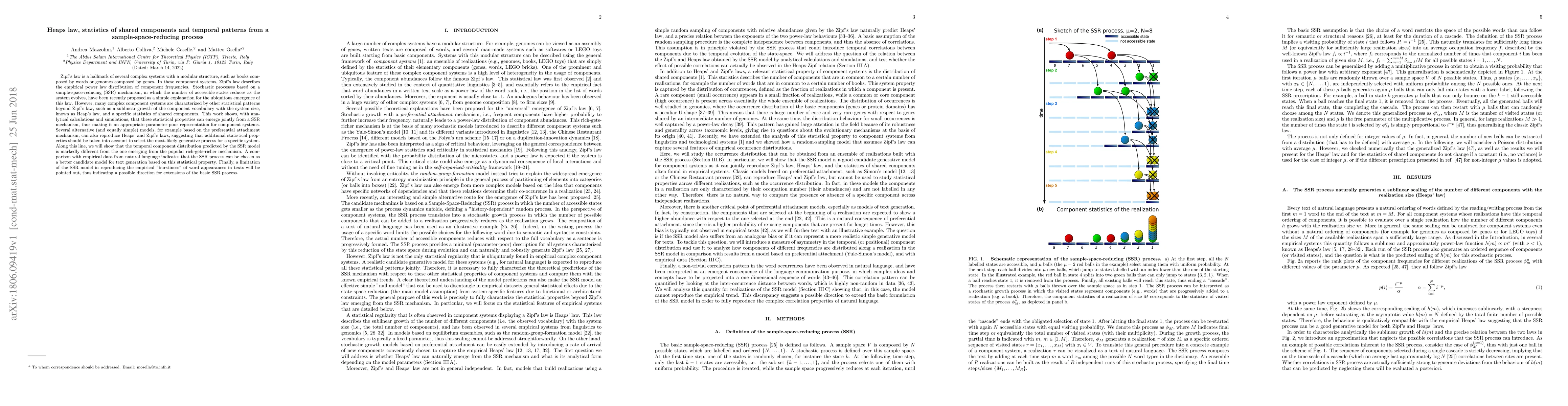 Zipf's law is a hallmark of several complex systems with a modular structure, such as books composed by words or genomes composed by genes. In these component systems, Zipf's law describes the empirical power law distribution of component frequencies. Stochastic processes based on a sample-space-reducing (SSR) mechanism, in which the number of accessible states reduces as the system evolves, have been recently proposed as a simple explanation for the ubiquitous emergence of this law. However, many complex component systems are characterized by other statistical patterns beyond Zipf's law, such as a sublinear growth of the component vocabulary with the system size, known as Heap's law, and a specific statistics of shared components. This work shows, with analytical calculations and simulations, that these statistical properties can emerge jointly from a SSR mechanism, thus making it an appropriate parameter-poor representation for component systems. Several alternative (and equally simple) models, for example based on the preferential attachment mechanism, can also reproduce Heaps' and Zipf's laws, suggesting that additional statistical properties should be taken into account to select the most-likely generative process for a specific system. Along this line, we will show that the temporal component distribution predicted by the SSR model is markedly different from the one emerging from the popular rich-gets-richer mechanism. A comparison with empirical data from natural language indicates that the SSR process can be chosen as a better candidate model for text generation based on this statistical property. Finally, a limitation of the SSR model in reproducing the empirical "burstiness" of word appearances in texts will be pointed out, thus indicating a possible direction for extensions of the basic SSR process.