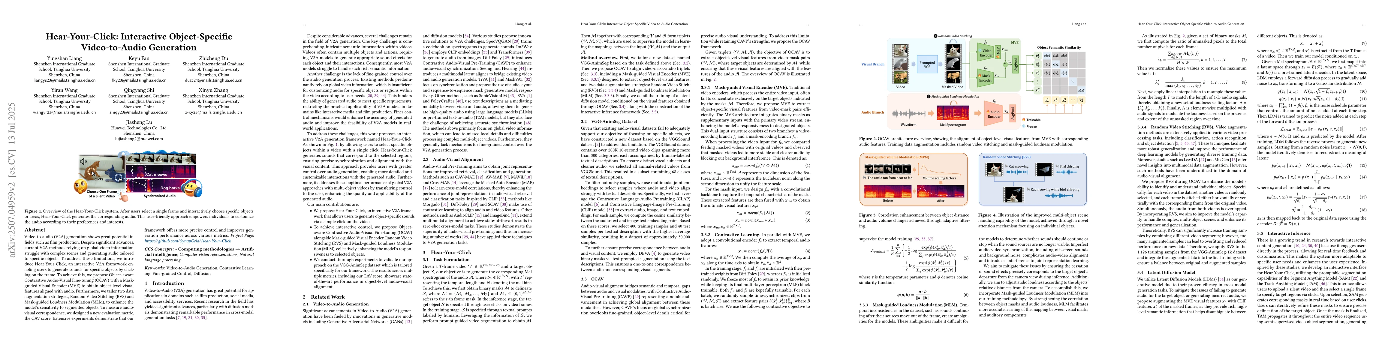 Video-to-audio (V2A) generation shows great potential in fields such as film production. Despite significant advances, current V2A methods relying on global video information struggle with complex scenes and generating audio tailored to specific objects. To address these limitations, we introduce Hear-Your-Click, an interactive V2A framework enabling users to generate sounds for specific objects by clicking on the frame. To achieve this, we propose Object-aware Contrastive Audio-Visual Fine-tuning (OCAV) with a Mask-guided Visual Encoder (MVE) to obtain object-level visual features aligned with audio. Furthermore, we tailor two data augmentation strategies, Random Video Stitching (RVS) and Mask-guided Loudness Modulation (MLM), to enhance the model's sensitivity to segmented objects. To measure audio-visual correspondence, we designed a new evaluation metric, the CAV score. Extensive experiments demonstrate that our framework offers more precise control and improves generation performance across various metrics. Project Page: https://github.com/SynapGrid/Hear-Your-Click