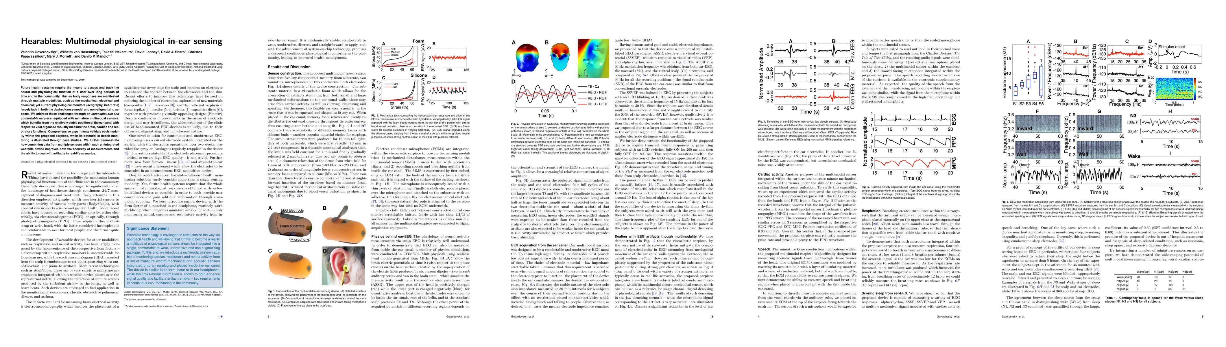 This research introduces 'hearbles', inconspicuous in-ear devices with multimodal sensors to monitor brain, cardiac, and respiratory functions. Experiments validate each sensor's accuracy, demonstrating improved measurement precision and artifact handling in real-life scenarios for potential health monitoring applications.