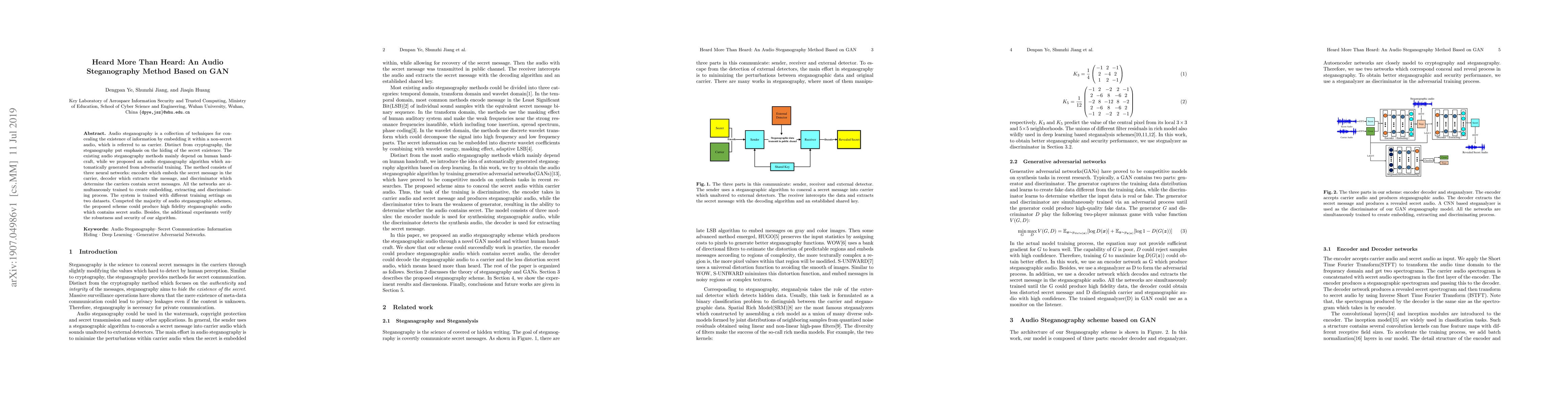 This paper proposes an audio steganography method using GANs, featuring an encoder, decoder, and discriminator neural network trained via adversarial learning to embed, extract, and detect secret messages in carrier audio. The method outperforms existing techniques in fidelity and demonstrates robustness and security.