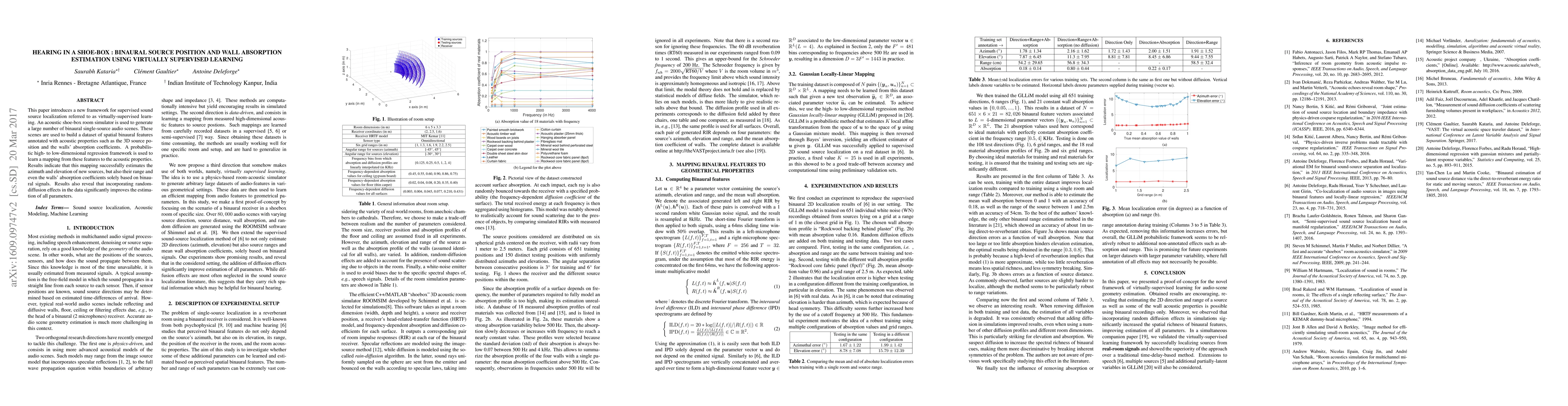 This paper proposes a virtually-supervised learning method for binaural sound source localization using a shoe-box room simulator to generate a dataset of binaural features. The method estimates 3D source positions and wall absorption coefficients from binaural signals, with improved accuracy when random diffusion effects are incorporated.