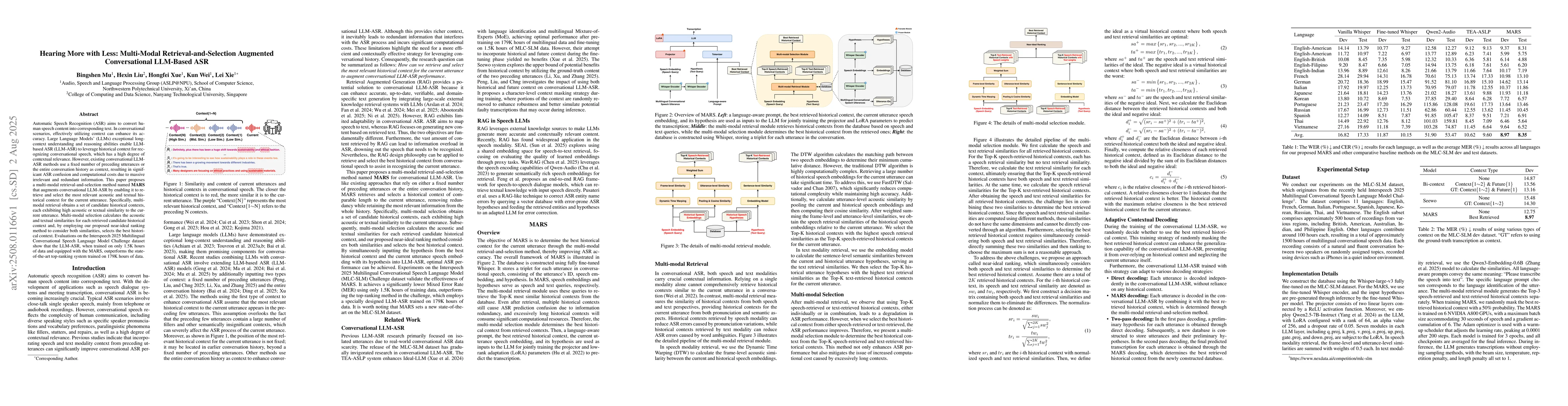 Automatic Speech Recognition (ASR) aims to convert human speech content into corresponding text. In conversational scenarios, effectively utilizing context can enhance its accuracy. Large Language Models' (LLMs) exceptional long-context understanding and reasoning abilities enable LLM-based ASR (LLM-ASR) to leverage historical context for recognizing conversational speech, which has a high degree of contextual relevance. However, existing conversational LLM-ASR methods use a fixed number of preceding utterances or the entire conversation history as context, resulting in significant ASR confusion and computational costs due to massive irrelevant and redundant information. This paper proposes a multi-modal retrieval-and-selection method named MARS that augments conversational LLM-ASR by enabling it to retrieve and select the most relevant acoustic and textual historical context for the current utterance. Specifically, multi-modal retrieval obtains a set of candidate historical contexts, each exhibiting high acoustic or textual similarity to the current utterance. Multi-modal selection calculates the acoustic and textual similarities for each retrieved candidate historical context and, by employing our proposed near-ideal ranking method to consider both similarities, selects the best historical context. Evaluations on the Interspeech 2025 Multilingual Conversational Speech Language Model Challenge dataset show that the LLM-ASR, when trained on only 1.5K hours of data and equipped with the MARS, outperforms the state-of-the-art top-ranking system trained on 179K hours of data.