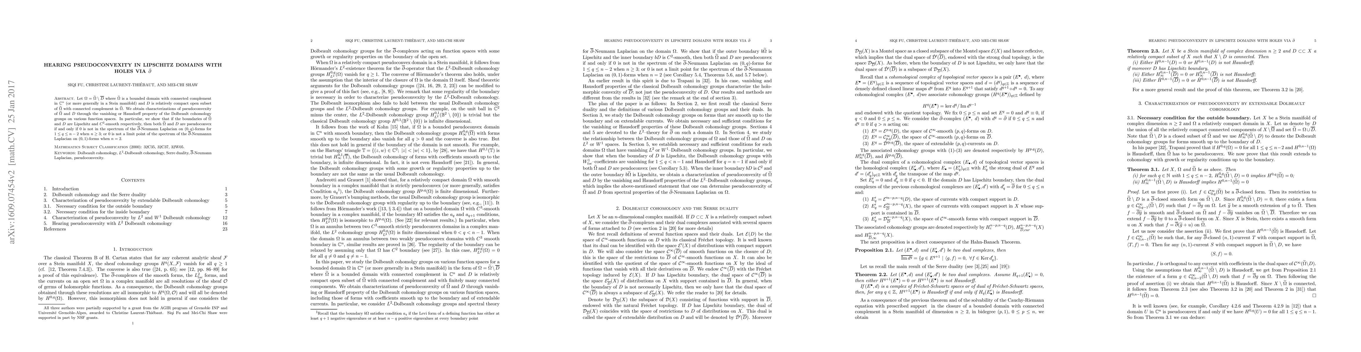 Let $\Omega=\widetilde{\Omega}\setminus \overline{D}$ where $\widetilde{\Omega}$ is a bounded domain with connected complement in $\mathbb C^n$ (or more generally in a Stein manifold) and $D$ is relatively compact open subset of $\widetilde{\Omega}$ with connected complement in $\widetilde{\Omega}$. We obtain characterizations of pseudoconvexity of $\widetilde{\Omega}$ and $D$ through the vanishing or Hausdorff property of the Dolbeault cohomology groups on various function spaces. In particular, we show that if the boundaries of $\widetilde{\Omega}$ and $D$ are Lipschitz and $C^2$-smooth respectively, then both $\widetilde{\Omega}$ and $D$ are pseudoconvex if and only if $0$ is not in the spectrum of the $\overline\partial$-Neumann Laplacian on $(0, q)$-forms for $1\le q\le n-2$ when $n\geq 3$; or $0$ is not a limit point of the spectrum of the $\overline\partial$-Neumannn Laplacian on $(0, 1)$-forms when $n=2$.