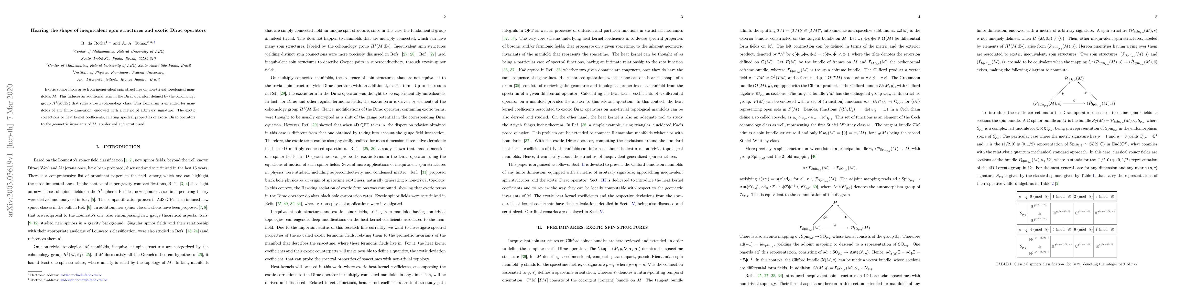 This research explores exotic spinor fields arising from distinct spin structures on non-trivial manifolds, introducing an extra term in the Dirac operator based on $H^1(M,mathbb{Z}_2)$. It extends this to any finite-dimensional manifolds with various signature metrics, deriving and examining exotic corrections to heat kernel coefficients linking spectral properties of Dirac operators to geometric invariants of M.