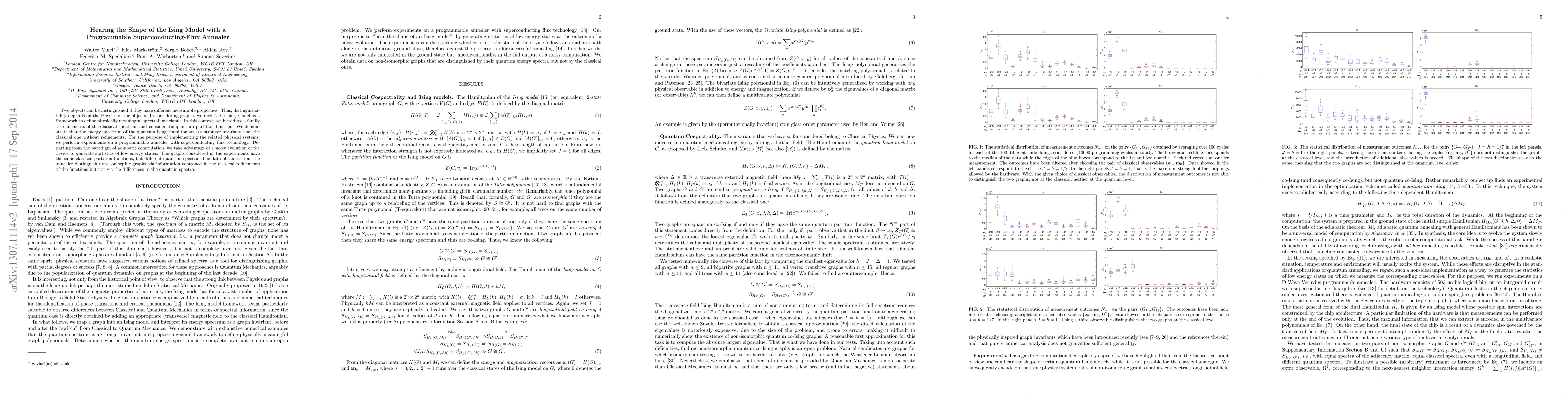 Two objects can be distinguished if they have different measurable properties. Thus, distinguishability depends on the Physics of the objects. In considering graphs, we revisit the Ising model as a framework to define physically meaningful spectral invariants. In this context, we introduce a family of refinements of the classical spectrum and consider the quantum partition function. We demonstrate that the energy spectrum of the quantum Ising Hamiltonian is a stronger invariant than the classical one without refinements. For the purpose of implementing the related physical systems, we perform experiments on a programmable annealer with superconducting flux technology. Departing from the paradigm of adiabatic computation, we take advantage of a noisy evolution of the device to generate statistics of low energy states. The graphs considered in the experiments have the same classical partition functions, but different quantum spectra. The data obtained from the annealer distinguish non-isomorphic graphs via information contained in the classical refinements of the functions but not via the differences in the quantum spectra.