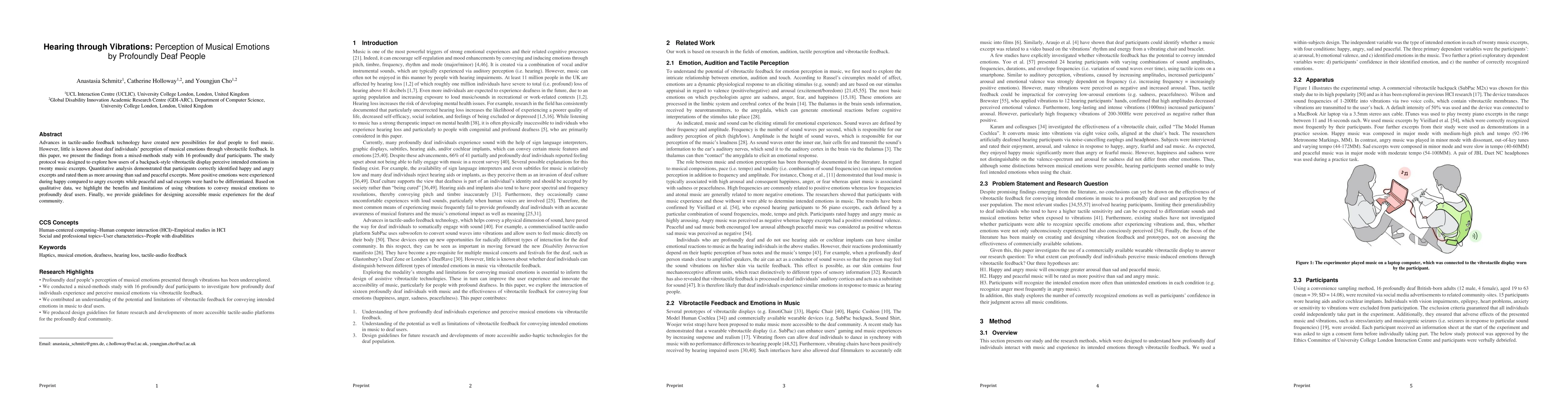 This study explores how profoundly deaf individuals perceive musical emotions via a vibrotactile backpack device, finding they can identify happy and angry music excerpts more accurately than sad or peaceful ones. The research provides insights into the benefits and challenges of using vibrations for emotional music perception, and offers guidelines for accessible music design.