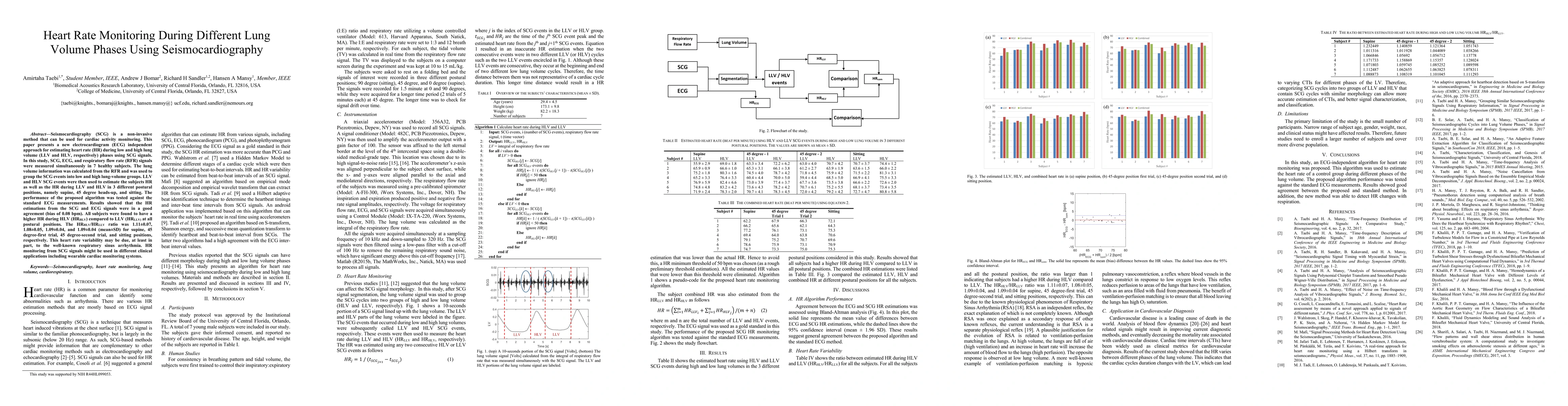 Seismocardiography (SCG) is a non-invasive method that can be used for cardiac activity monitoring. This paper presents a new electrocardiogram (ECG) independent approach for estimating heart rate (HR) during low and high lung volume (LLV and HLV, respectively) phases using SCG signals. In this study, SCG, ECG, and respiratory flow rate (RFR) signals were measured simultaneously in 7 healthy subjects. The lung volume information was calculated from the RFR and was used to group the SCG events into low and high lung-volume groups. LLV and HLV SCG events were then used to estimate the subjects HR as well as the HR during LLV and HLV in 3 different postural positions, namely supine, 45 degree heads-up, and sitting. The performance of the proposed algorithm was tested against the standard ECG measurements. Results showed that the HR estimations from the SCG and ECG signals were in a good agreement (bias of 0.08 bpm). All subjects were found to have a higher HR during HLV (HR$_\text{HLV}$) compared to LLV (HR$_\text{LLV}$) at all postural positions. The HR$_\text{HLV}$/HR$_\text{LLV}$ ratio was 1.11$\pm$0.07, 1.08$\pm$0.05, 1.09$\pm$0.04, and 1.09$\pm$0.04 (mean$\pm$SD) for supine, 45 degree-first trial, 45 degree-second trial, and sitting positions, respectively. This heart rate variability may be due, at least in part, to the well-known respiratory sinus arrhythmia. HR monitoring from SCG signals might be used in different clinical applications including wearable cardiac monitoring systems.