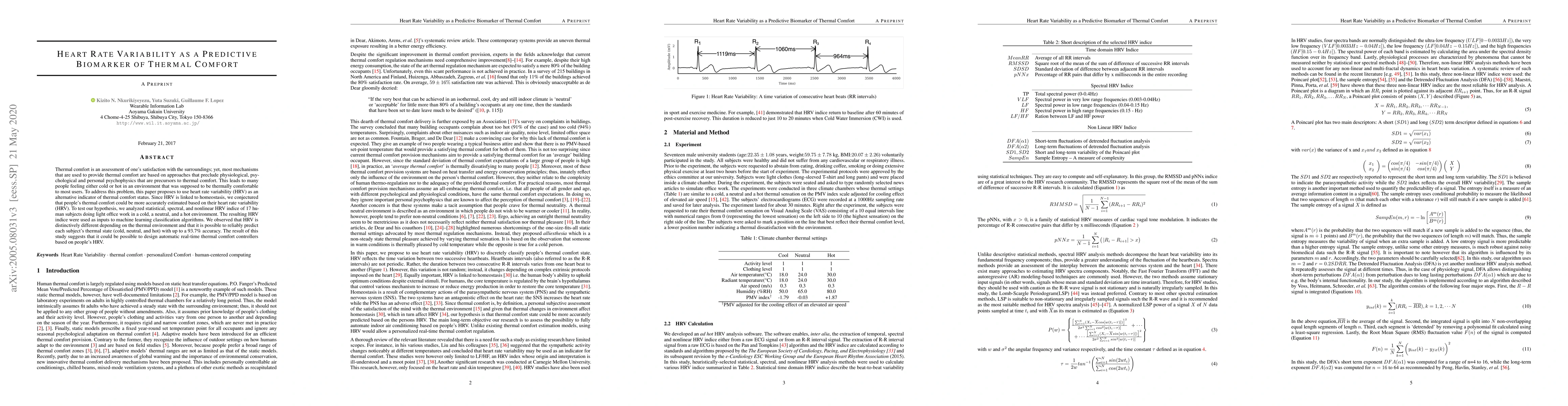 This paper proposes heart rate variability (HRV) as a predictive biomarker for thermal comfort, demonstrating that HRV indices differ significantly across cold, neutral, and hot environments. Machine learning algorithms achieved up to 93.7% accuracy in predicting thermal states, suggesting HRV could enable more accurate, real-time thermal comfort control.