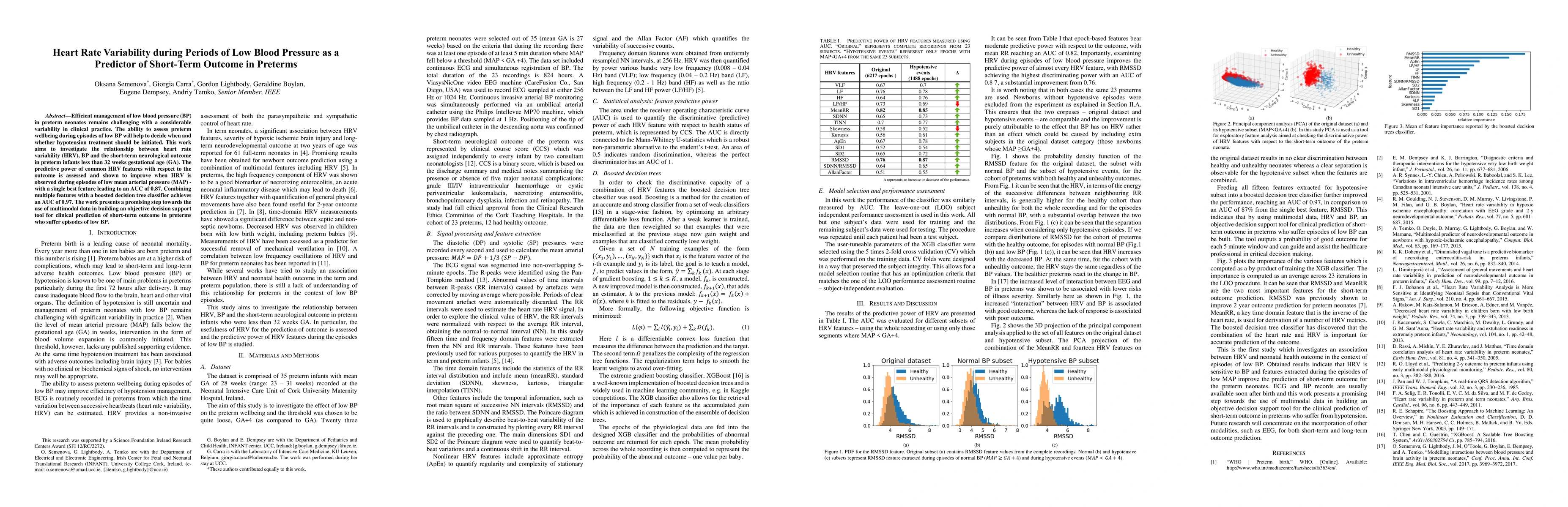 This study investigates how heart rate variability (HRV) during low blood pressure episodes can predict short-term neurological outcomes in preterm infants. The research finds that HRV features, especially during low mean arterial pressure, significantly improve predictive accuracy, with a boosted decision tree classifier achieving an AUC of 0.97.