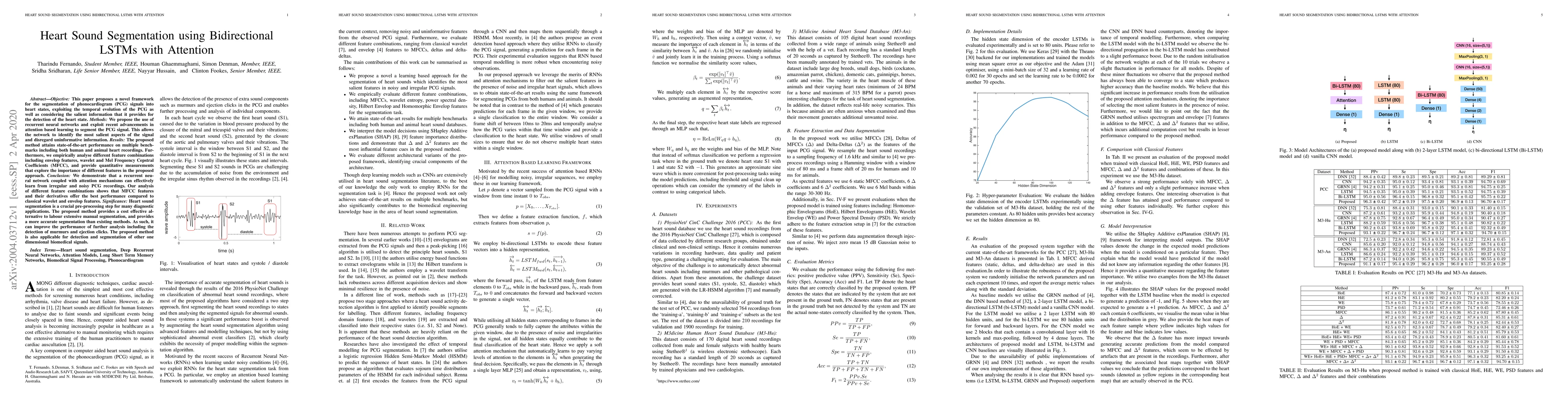 This paper introduces a bidirectional LSTM with attention mechanism for segmenting phonocardiogram (PCG) signals into heart states, achieving state-of-the-art performance. The method effectively learns from noisy recordings and outperforms traditional methods, especially when using Mel Frequency Cepstral Coefficients (MFCC) features.