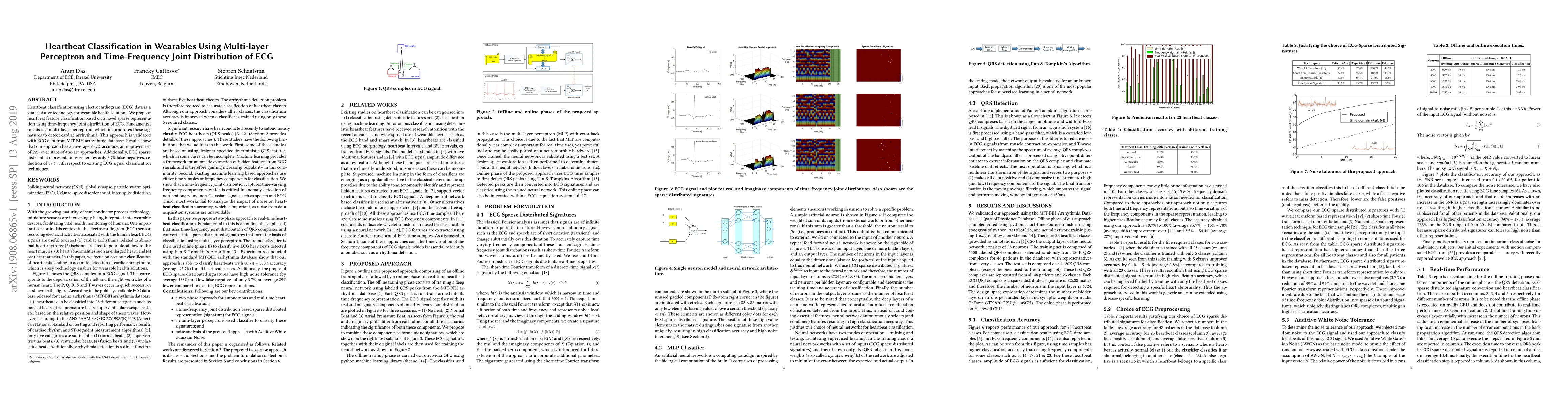 This paper proposes a novel heartbeat classification method using a multi-layer perceptron and time-frequency joint distribution of ECG data, achieving 95.7% accuracy and significantly reducing false negatives to 3.7%, outperforming existing techniques by 22%.