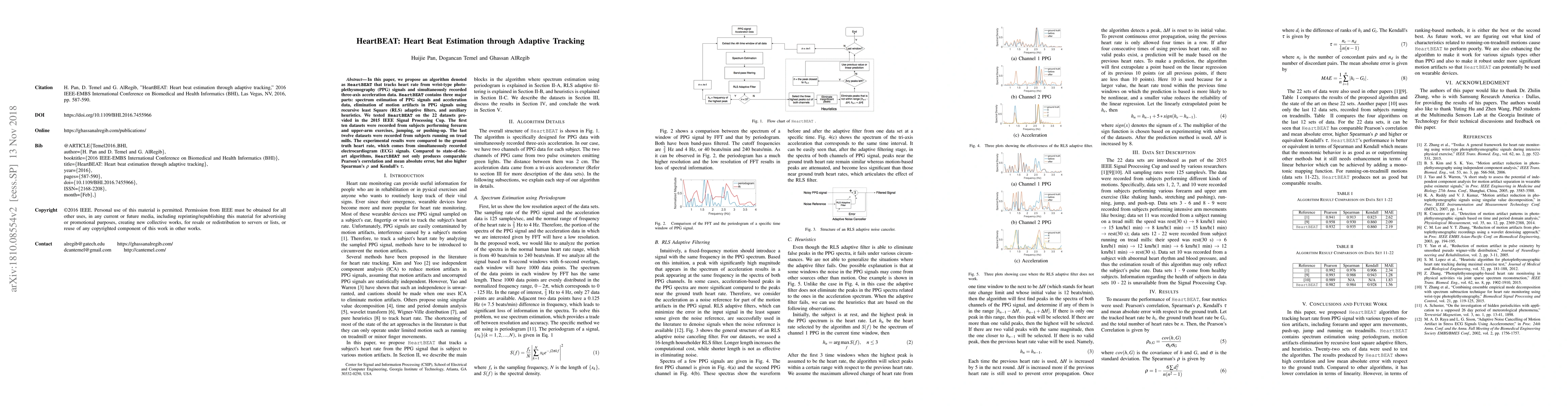 HeartBEAT is an algorithm for estimating heart rate from wrist-type PPG and acceleration data, employing adaptive filtering and heuristics. It outperforms other methods in correlation metrics and ranks higher in non-linear agreement metrics when tested on diverse physical activity datasets.