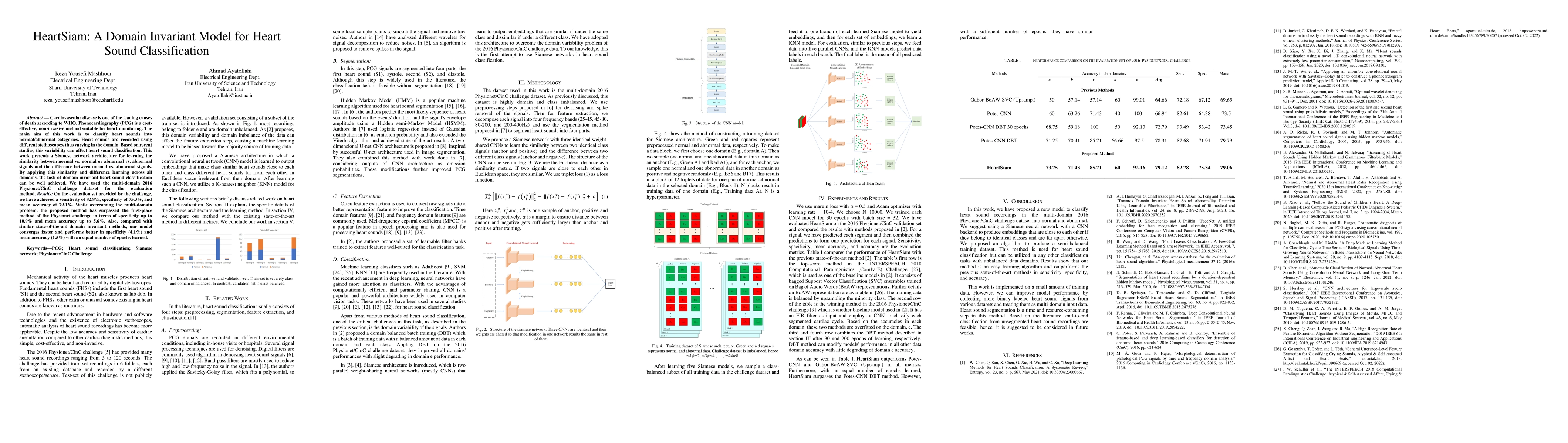 This is the first attempt to use Siamese networks in heart sound classification, addressing the domain variability problem in the 2016 Physionet/CinC challenge dataset.