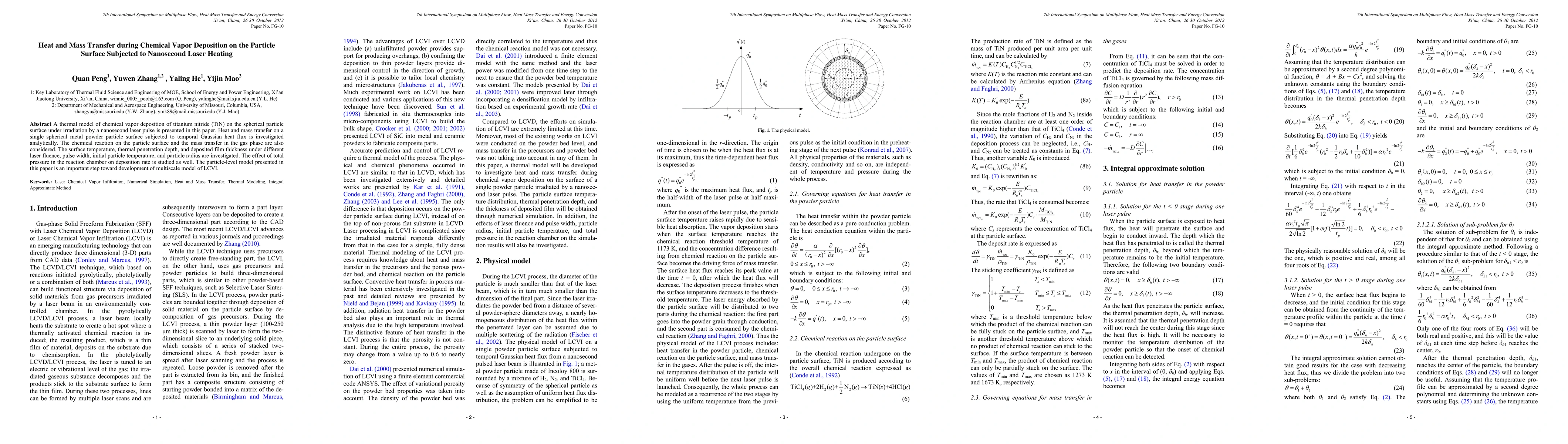 A thermal model of chemical vapor deposition of titanium nitride (TiN) on the spherical particle surface under irradiation by a nanosecond laser pulse is presented in this paper. Heat and mass transfer on a single spherical metal powder particle surface subjected to temporal Gaussian heat flux is investigated analytically. The chemical reaction on the particle surface and the mass transfer in the gas phase are also considered. The surface temperature, thermal penetration depth, and deposited film thickness under different laser fluence, pulse width, initial particle temperature, and particle radius are investigated. The effect of total pressure in the reaction chamber on deposition rate is studied as well. The particle-level model presented in this paper is an important step toward development of multiscale model of LCVI.