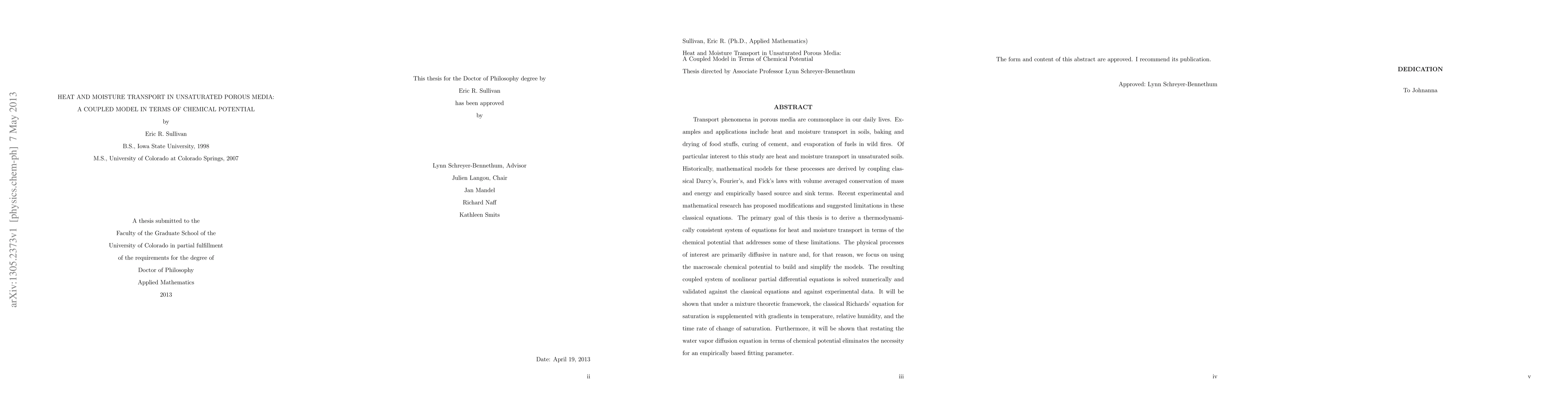 Transport phenomena in porous media are commonplace in our daily lives. Examples and applications include heat and moisture transport in soils, baking and drying of food stuffs, curing of cement, and evaporation of fuels in wild fires. Of particular interest to this study are heat and moisture transport in unsaturated soils. Historically, mathematical models for these processes are derived by coupling classical Darcy's, Fourier's, and Fick's laws with volume averaged conservation of mass and energy and empirically based source and sink terms. Recent experimental and mathematical research has proposed modifications and suggested limitations in these classical equations. The primary goal of this thesis is to derive a thermodynamically consistent system of equations for heat and moisture transport in terms of the chemical potential that addresses some of these limitations. The physical processes of interest are primarily diffusive in nature and, for that reason, we focus on using the macroscale chemical potential to build and simplify the models. The resulting coupled system of nonlinear partial differential equations is solved numerically and validated against the classical equations and against experimental data. It will be shown that under a mixture theoretic framework, the classical Richards' equation for saturation is supplemented with gradients in temperature, relative humidity, and the time rate of change of saturation. Furthermore, it will be shown that restating the water vapor diffusion equation in terms of chemical potential eliminates the necessity for an empirically based fitting parameter.