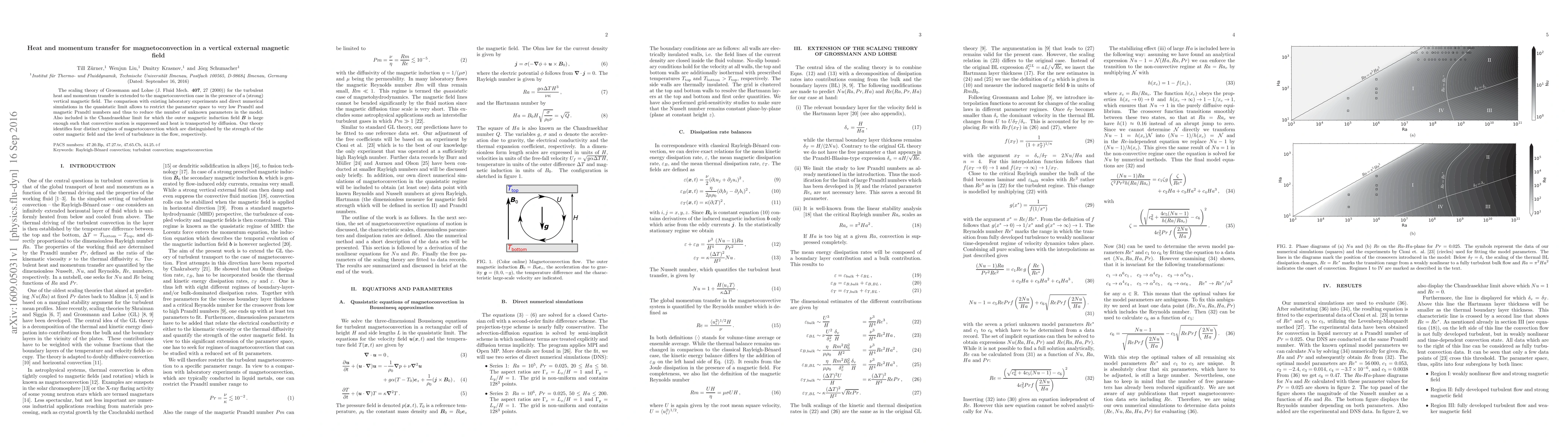 This paper extends Grossmann and Lohse's scaling theory for turbulent heat and momentum transfer to magnetoconvection under a strong vertical magnetic field, identifying four distinct regimes based on magnetic field strength and turbulence levels. The theory is validated against laboratory experiments and simulations, focusing on low Prandtl and magnetic Prandtl numbers.