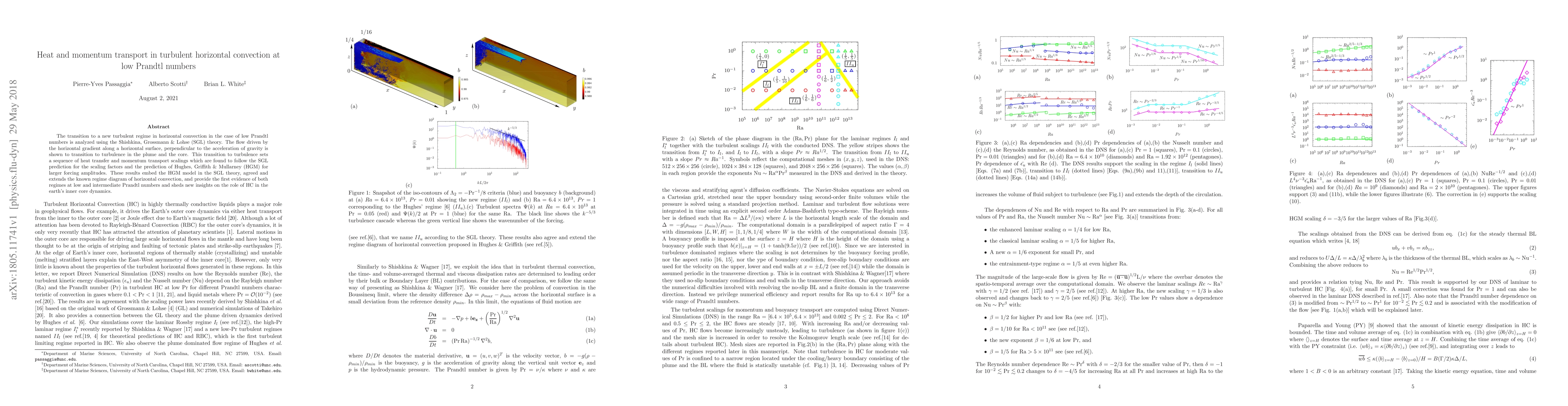 The transition to a new turbulent regime in horizontal convection in the case of low Prandtl numbers is analyzed using the Shishkina, Grossmann & Lohse (SGL) theory. The flow driven by the horizontal gradient along a horizontal surface, perpendicular to the acceleration of gravity is shown to transition to turbulence in the plume and the core. This transition to turbulence sets a sequence of heat transfer and momentum transport scalings which are found to follow the SGL prediction for the scaling factors and the prediction of Hughes, Griffith & Mullarney (HGM) for larger forcing amplitudes. These results embed the HGM model in the SGL theory, agreed and extends the known regime diagram of horizontal convection, and provide the first evidence of both regimes at low and intermediate Prandtl numbers and sheds new insights on the role of HC in the earth's inner core dynamics.
