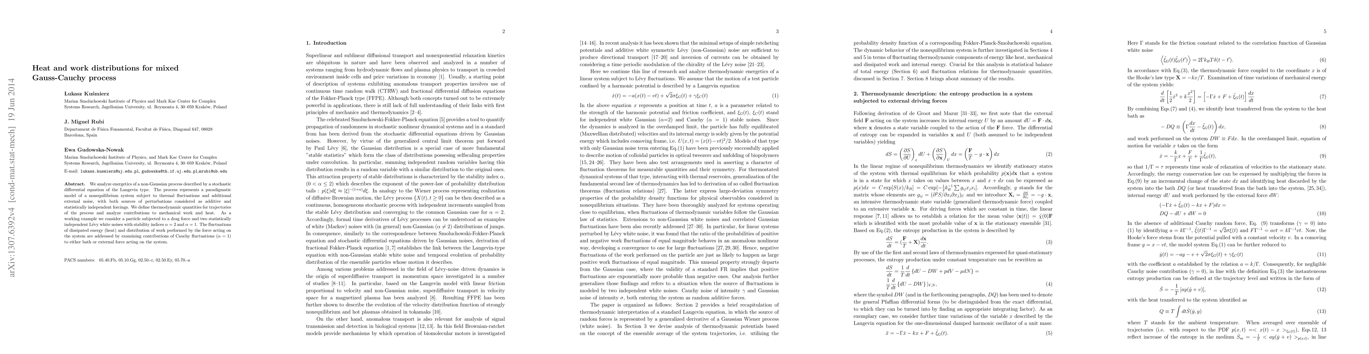 This research analyzes a non-Gaussian stochastic process, modeling a nonequilibrium system with thermal fluctuations and external noise. It defines thermodynamic quantities for the process' trajectories, focusing on work and heat contributions, using a particle with drag force and two independent Levy white noises as a case study. Key findings involve examining fluctuations in dissipated energy and work distribution, attributing these to Cauchy fluctuations.